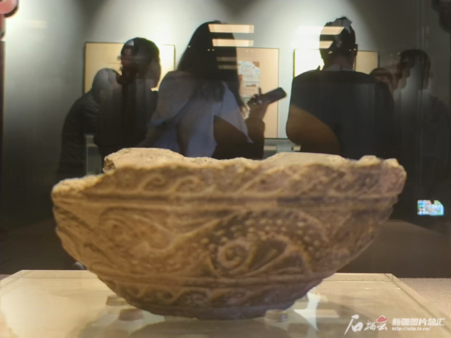 游客正在参观马首龙身鹰翅纹灰陶范。天山网-新疆日报记者王新红摄