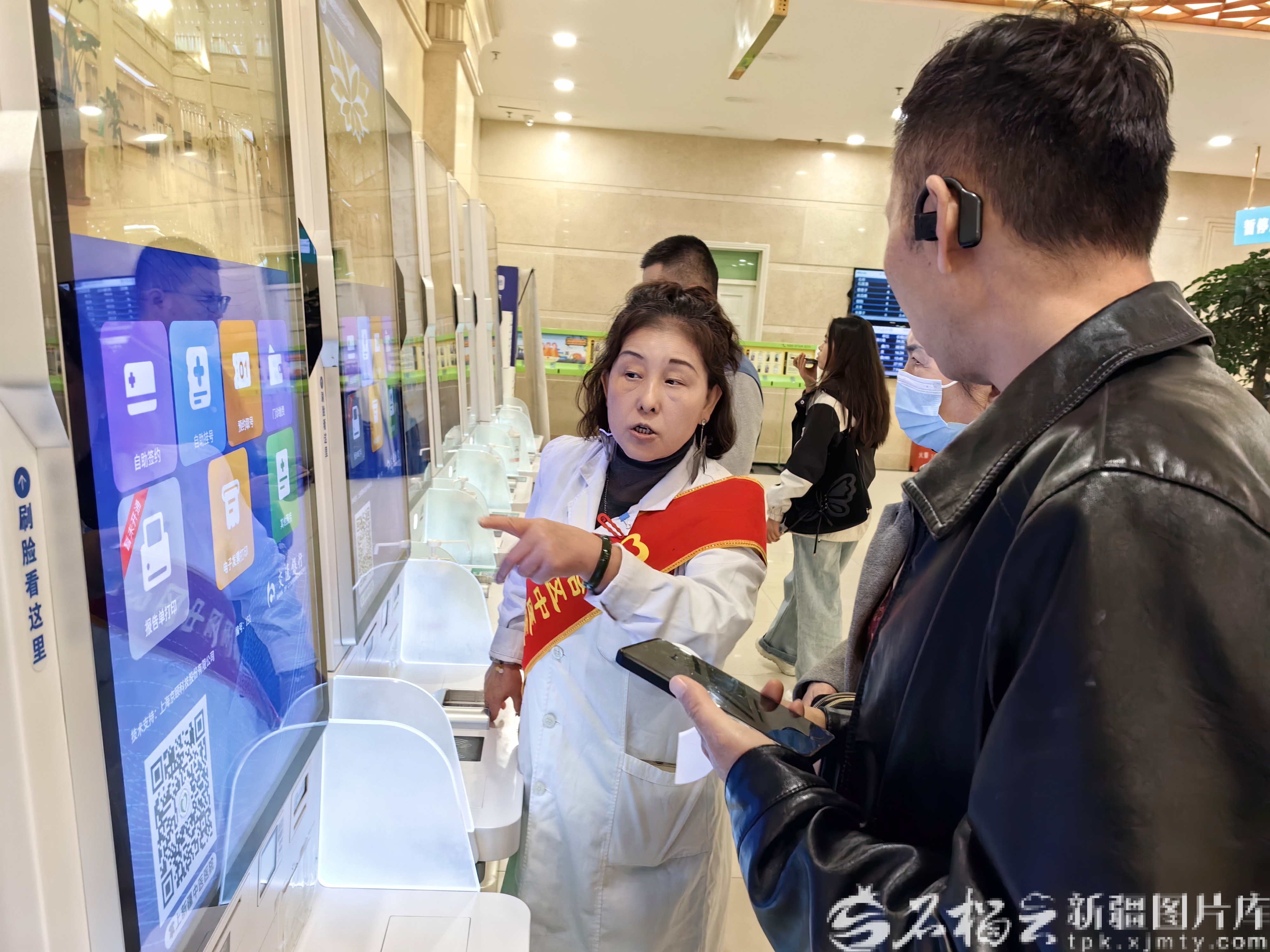 10月9日,在自治区中医医院门诊大厅,一位志愿者在为患者进行引导服务。天山网-新疆日报记者 李雄心摄