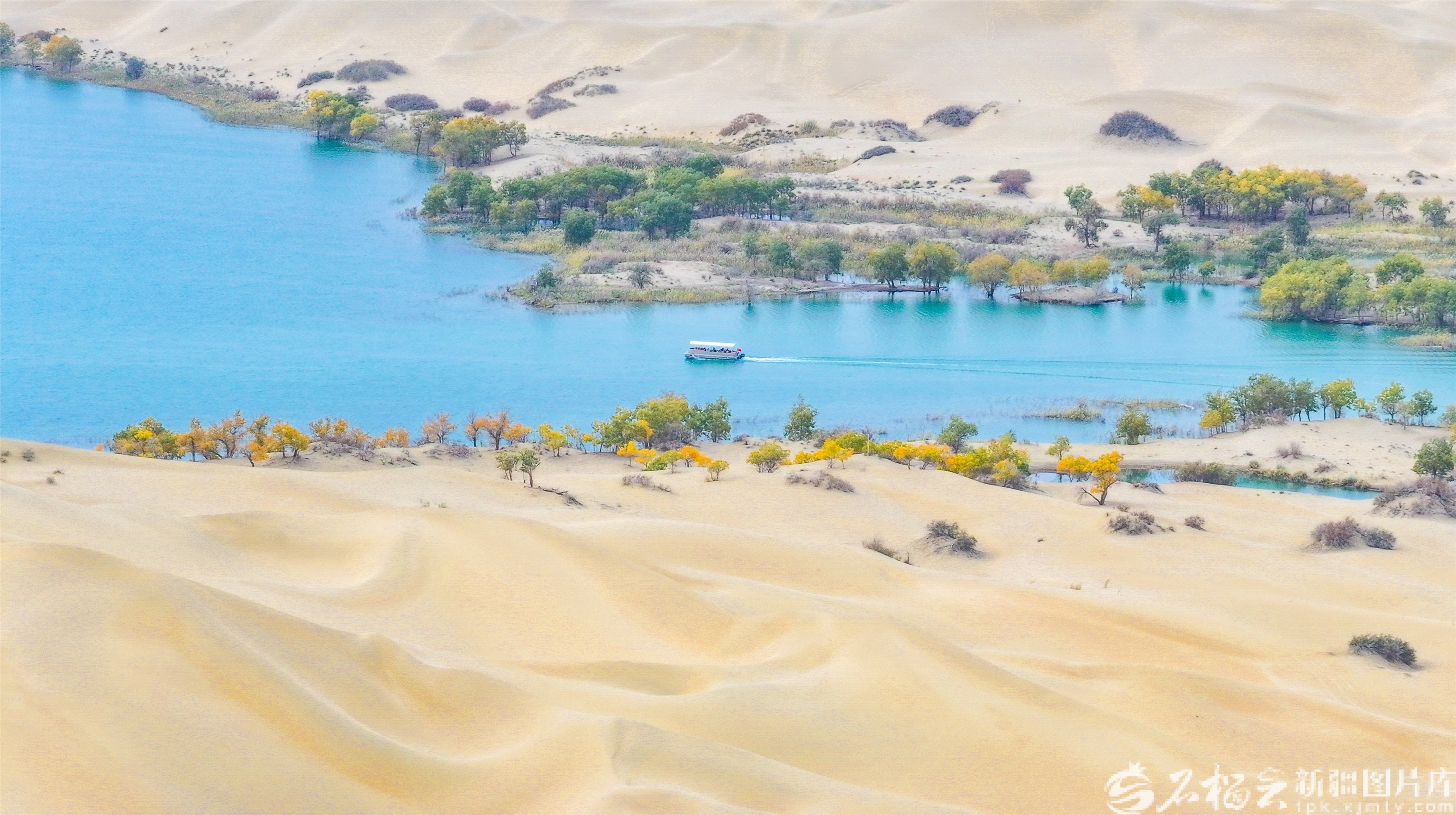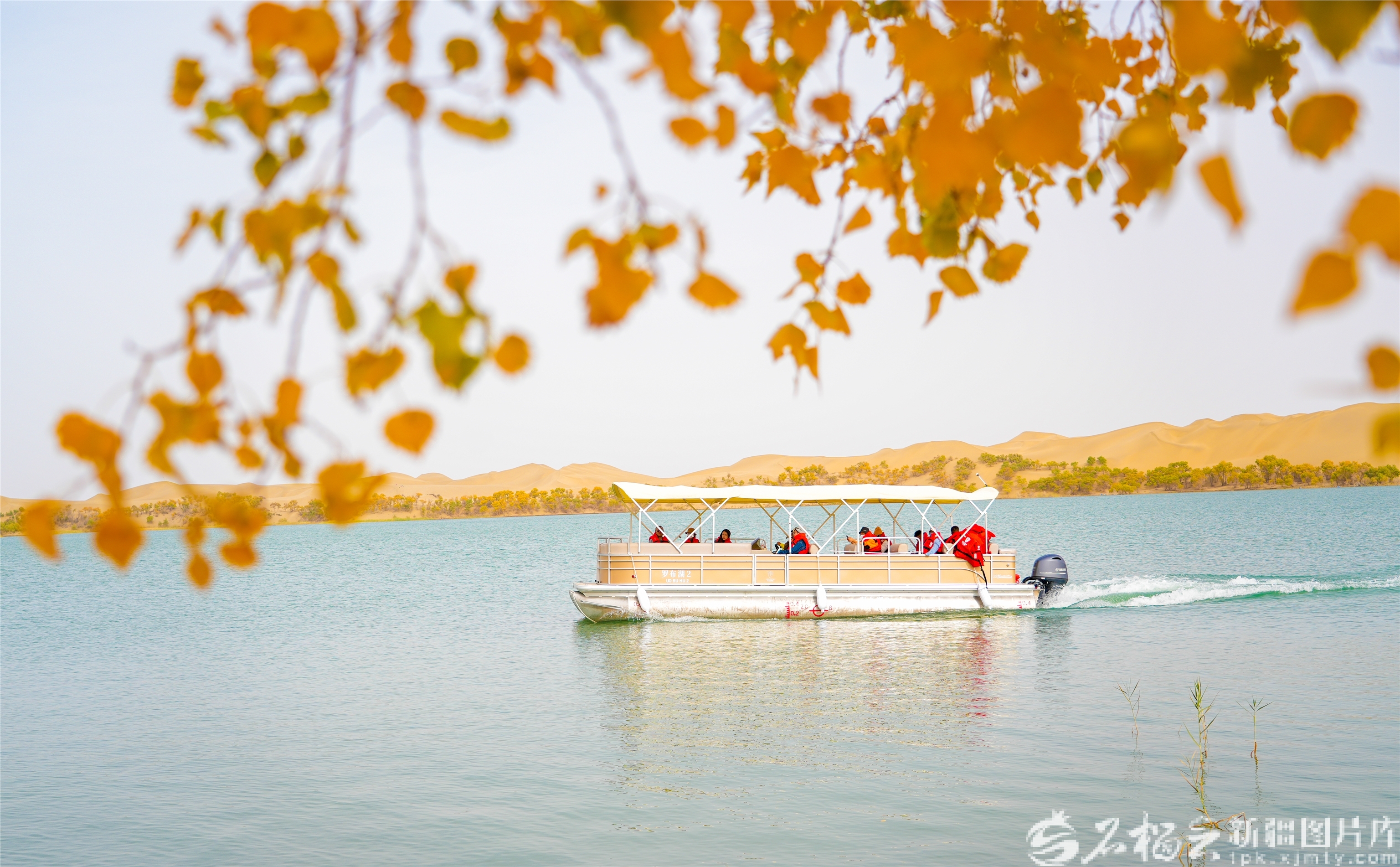 10月8日,游客在塔克拉玛干沙漠中的尉犁县罗布湖乘船游览,沉浸式感受沙漠湖泊秋日美景。 □汪志鹏摄