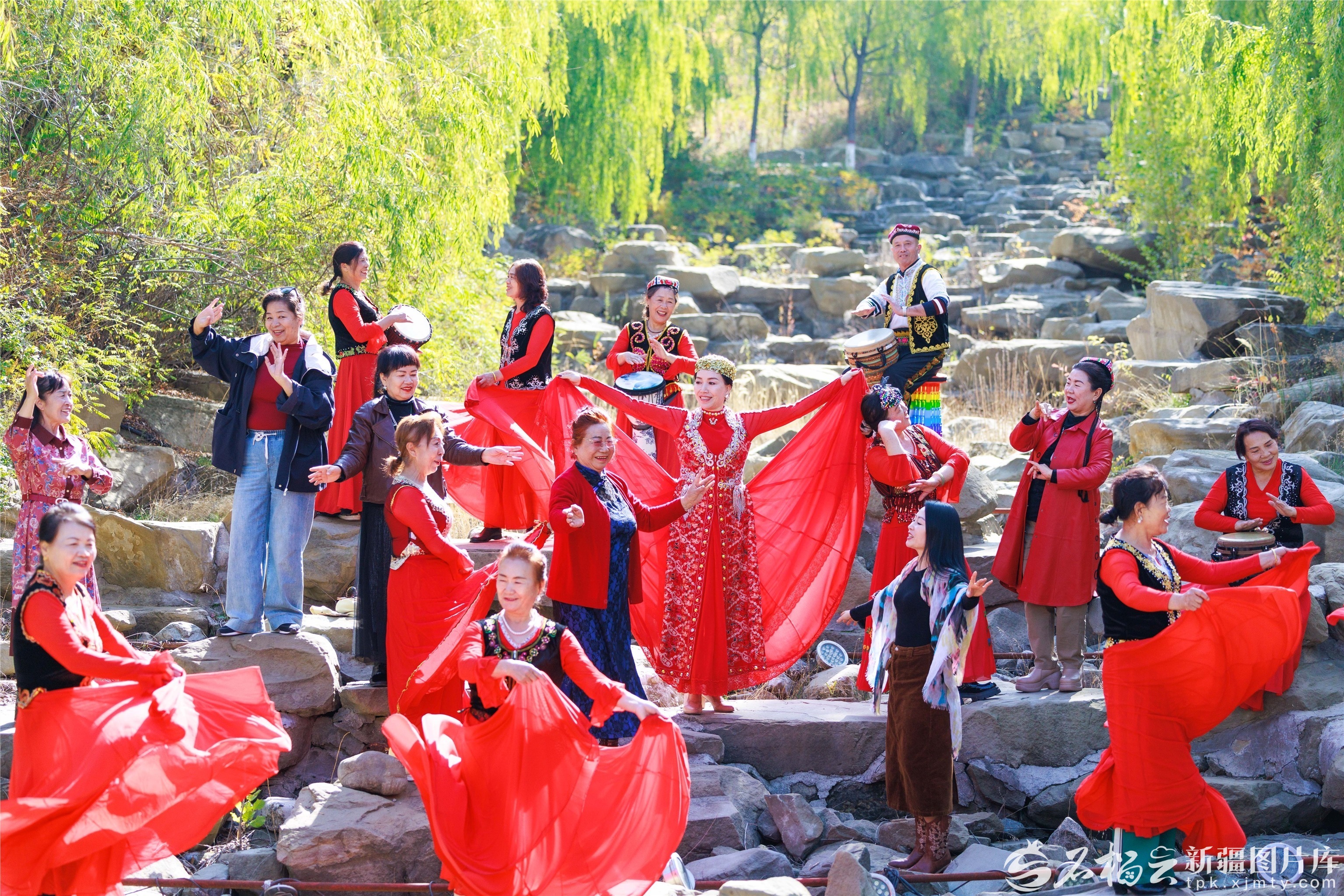 10月11日,乌鲁木齐经济技术开发区(头屯河区)文化体育和旅游局组织部分社区居民来到小绿谷公园游玩,乐享秋日好时光。图为居民在打非洲鼓。 孙振嵩摄