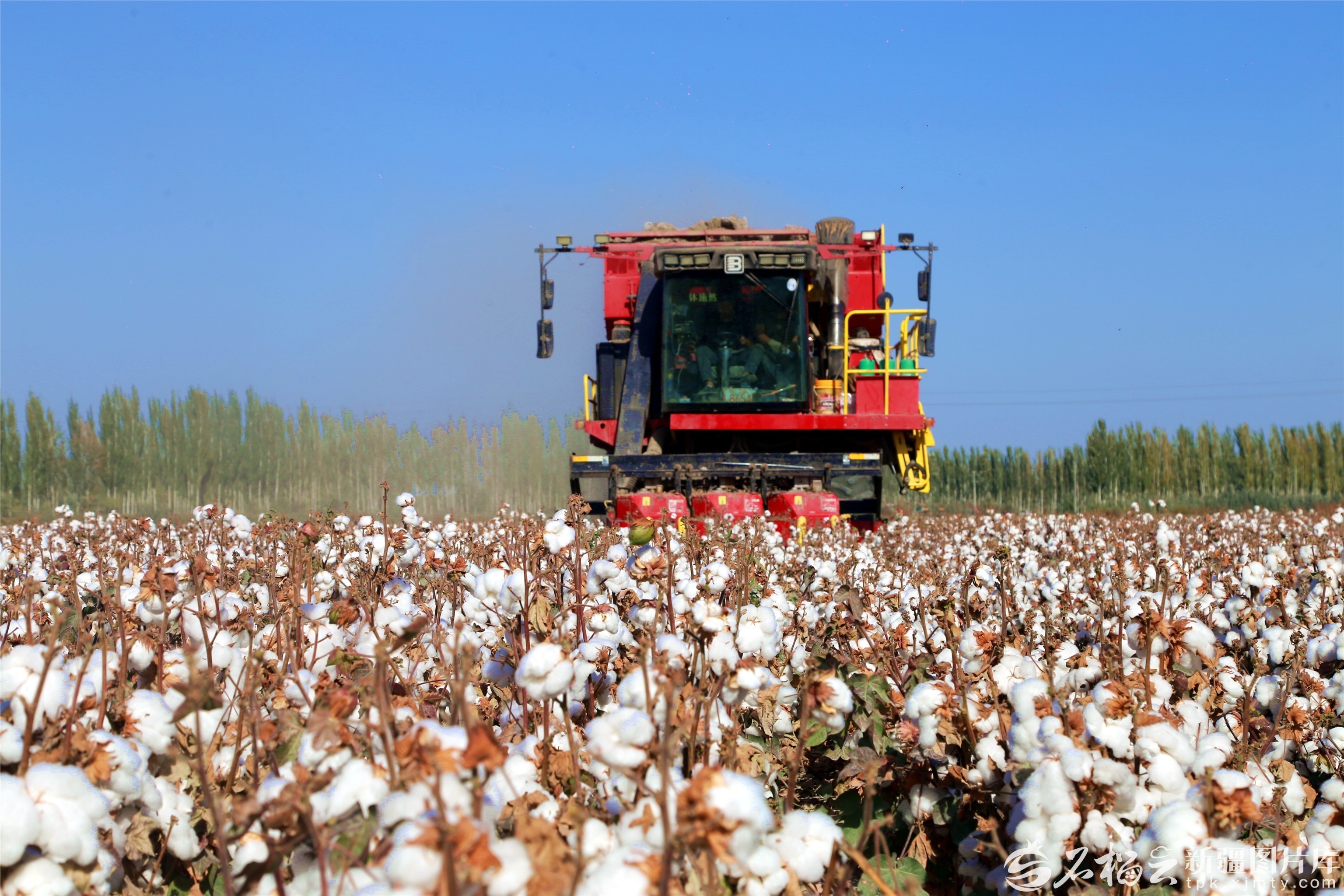 10月11日,采棉机在阿瓦提县拜什艾日克镇仓村的棉田里采收棉花。眼下,阿瓦提县种植的144.98万亩棉花陆续进入采收期,棉农抢抓晴好天气采收,确保朵絮归仓。 包良廷摄
