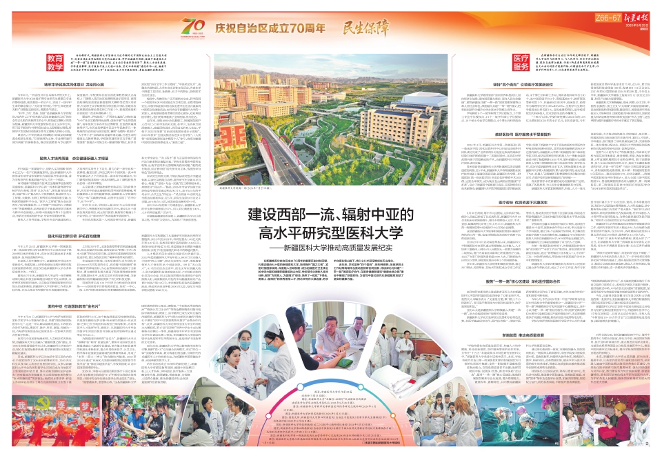 站在自治区成立70周年的新征程上,新疆医科大学将锚定教育强国、健康中国战略目标,以人才培养、学科建设、医疗服务三大战略支柱为基,协同赋能、锐意革新,为保障人民群众健康、推动新疆经济社会高质量发展作出新医贡献。