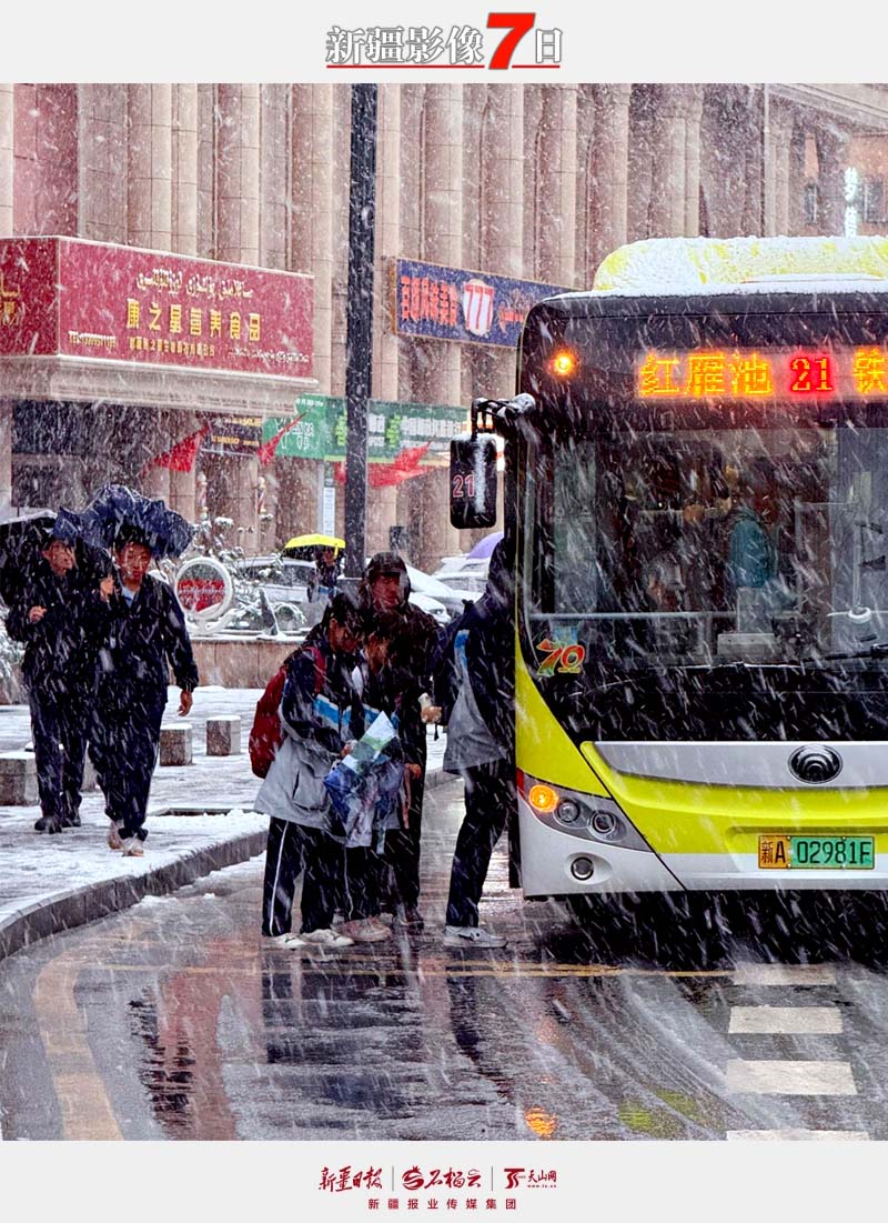 10月15日清晨,市民冒雪乘坐公交车。当日,乌鲁木齐市区迎来降雪降温天气。纷飞雪花覆盖路面,部分路段出现薄冰,加上气温骤降,行人步履匆匆,车辆行驶需格外谨慎,给市民日常出行带来不小挑战。天山网-新疆日报记者 约提克尔·尼加提 摄