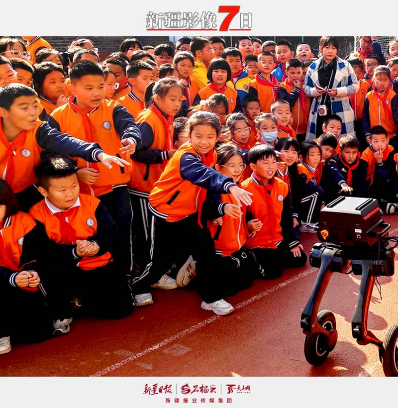 10月17日,学生在乌鲁木齐市第121小学操场上近距离观看机器人表演。当日,乌鲁木齐市科学技术协会联合多部门在乌鲁木齐市第121小学开展了“科技之光,闪动校园”快闪活动,以“短、平、快”的沉浸式体验为特色,让科学走出实验室、走进校园。天山网-新疆日报记者 蔡增乐 摄