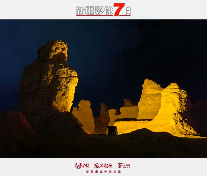 10月13日,在吐鲁番市拍摄的交河故城夜景。吐鲁番市积极探索“文旅融合”新模式推出“夜游交河”活动,通过精心设计的灯光秀,让游客在光影交错中聆听历史回响,感受“活着的遗址”。天山网-新疆日报记者 蔡增乐 摄