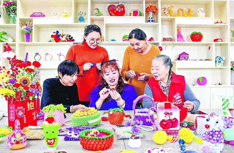 10月23日,在新疆老年开放大学奎屯分校老师指导下,奎屯市乌鲁木齐西路街道闻莺园社区居民学习编织。周康摄