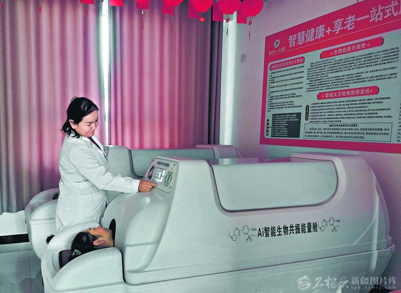 10月24日,库车市城南街道禧源社区日间照料中心,居民接受AI智能生物共振能量舱理疗。王红丽摄
