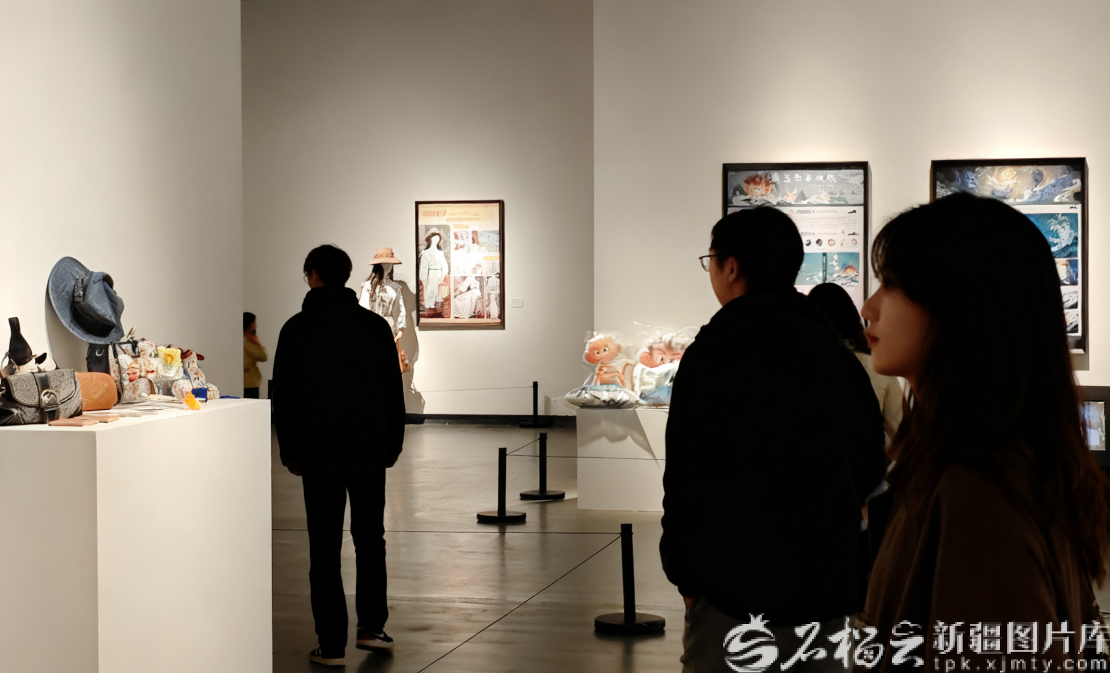 展厅内,艺术与创意交融,青春气息扑面而来。展览作品种类繁多,既有扎根于生活,深情描绘新疆风土人情的各类画作,也不乏兼具互动性与思辨性的装置艺术作品,另有实用性和美学并重的文创设计产品。丰富的艺术作品表达青年一代对时代、对自我、对未来的思考,引发观众的广泛共鸣。穿行于展厅中,大学生吐尔逊·艾则孜与同伴不时驻足交流,“看到同龄人的优秀作品,无论是对文化的表达,还是对创意的呈现,都特别有想法,给我们很多启发。”