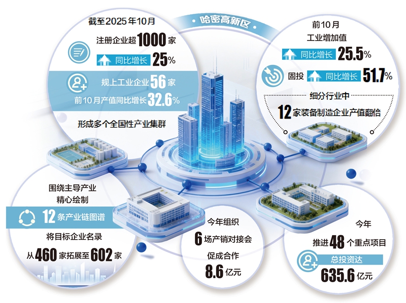 截至2025年10月,哈密高新区注册企业超1000家,同比增长25%,规上工业企业56家,形成多个全国性产业集群。前10月,哈密高新区规上企业产值同比增长32.6%,工业增加值同比增长25.5%,固投同比增长51.7%。细分行业中,12家装备制造企业产值翻倍。哈密高新区综合指标居全疆园区第一梯队,成为新疆园区高质量发展“排头兵”。
