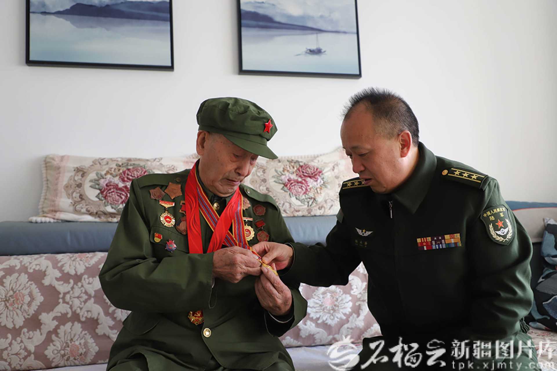 杨永泽(右)探望抗美援朝老兵居海明。崔建涛摄