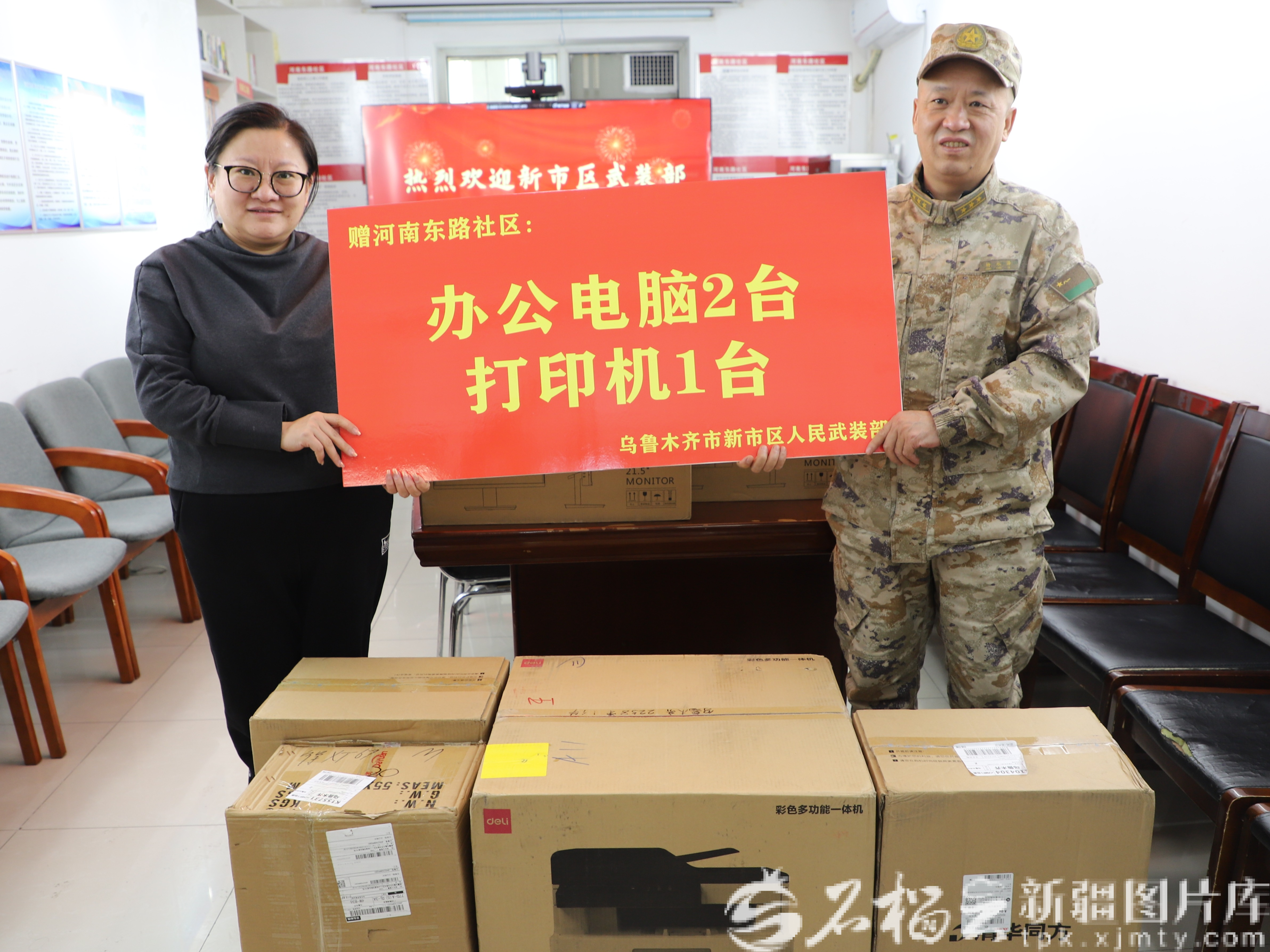 杨永泽(右)代表新市区人武部向社区赠送办公用品。崔建涛摄