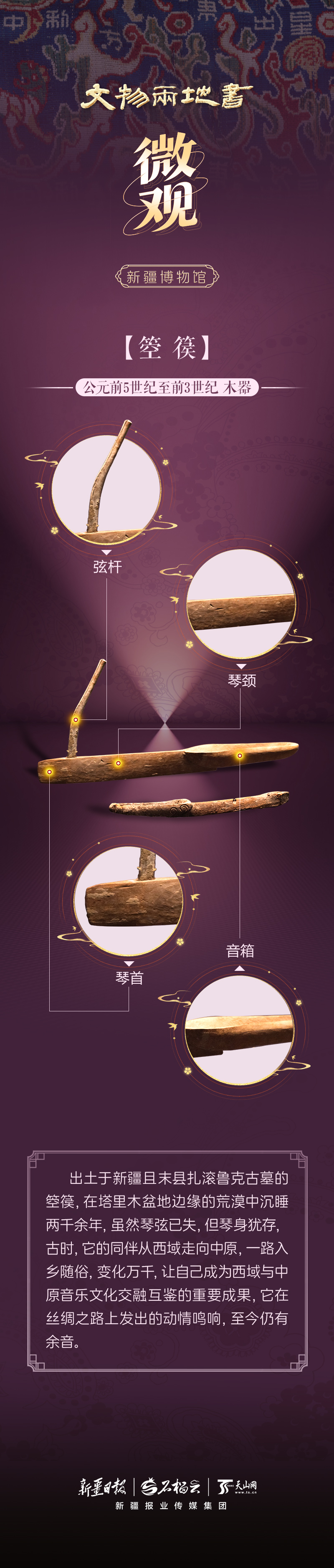 出土于新疆且末县扎滚鲁克古墓的箜篌,在塔里木盆地边缘的荒漠中沉睡两千余年,虽然琴弦已失,但琴身犹存,古时,它的同伴从西域走向中原,一路入乡随俗,变化万千,让自己成为西域与中原音乐文化交融互鉴的重要成果,它在丝绸之路上发出的动情鸣响,至今仍有余音。