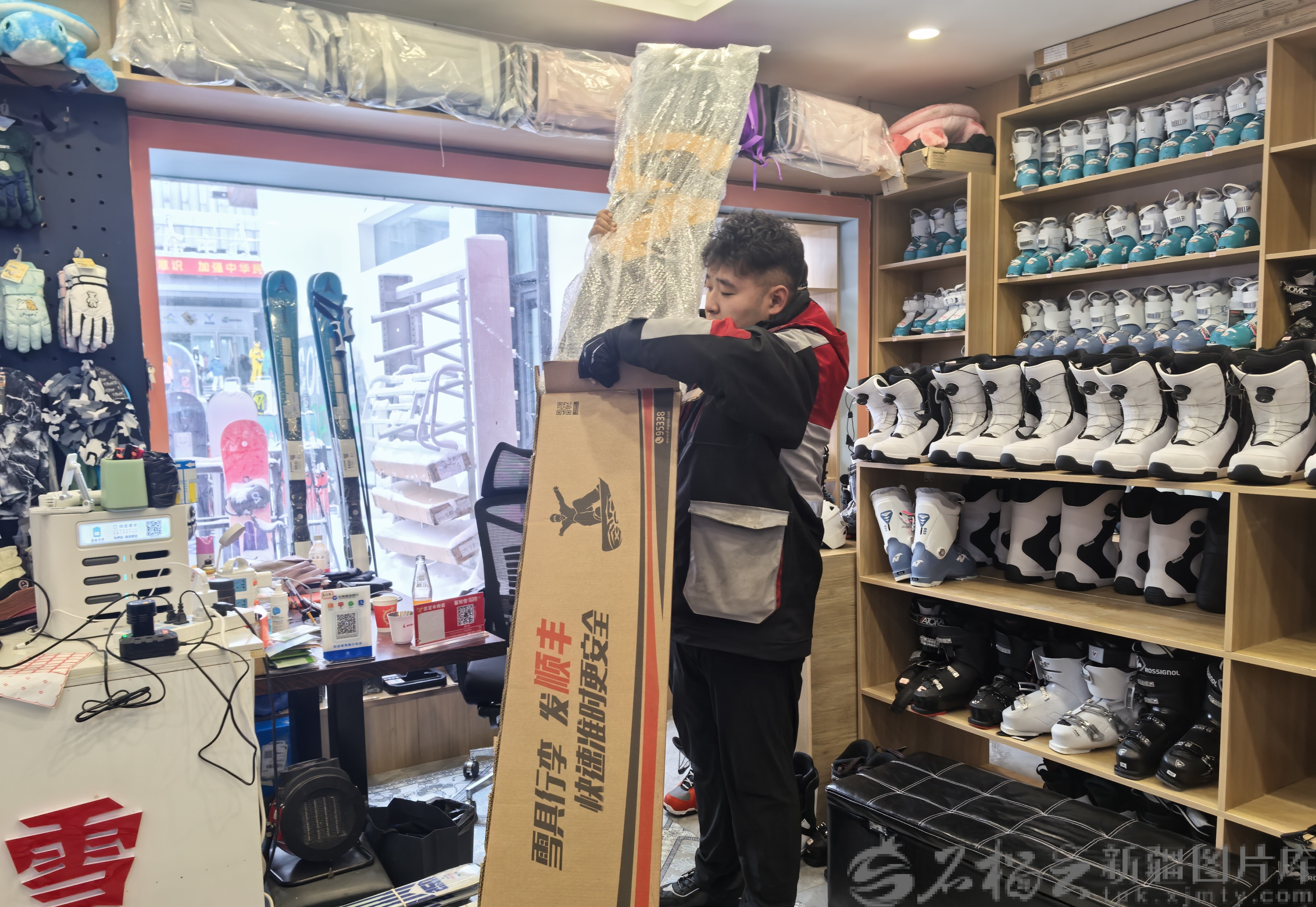 12月17日,阿勒泰市将军山国际滑雪场,顺丰快递员在打包发运的雪板。艾丽米拉·巴合达艾力摄