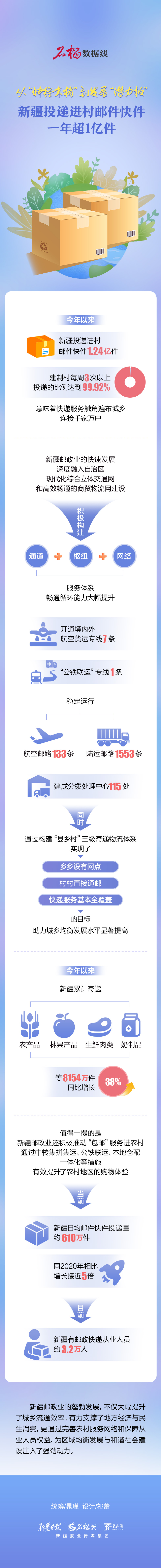 今年以来,新疆投递进村邮件快件1.24亿件,建制村每周3次以上投递的比例达到99.92%,意味着快递服务触角遍布城乡,连接千家万户。