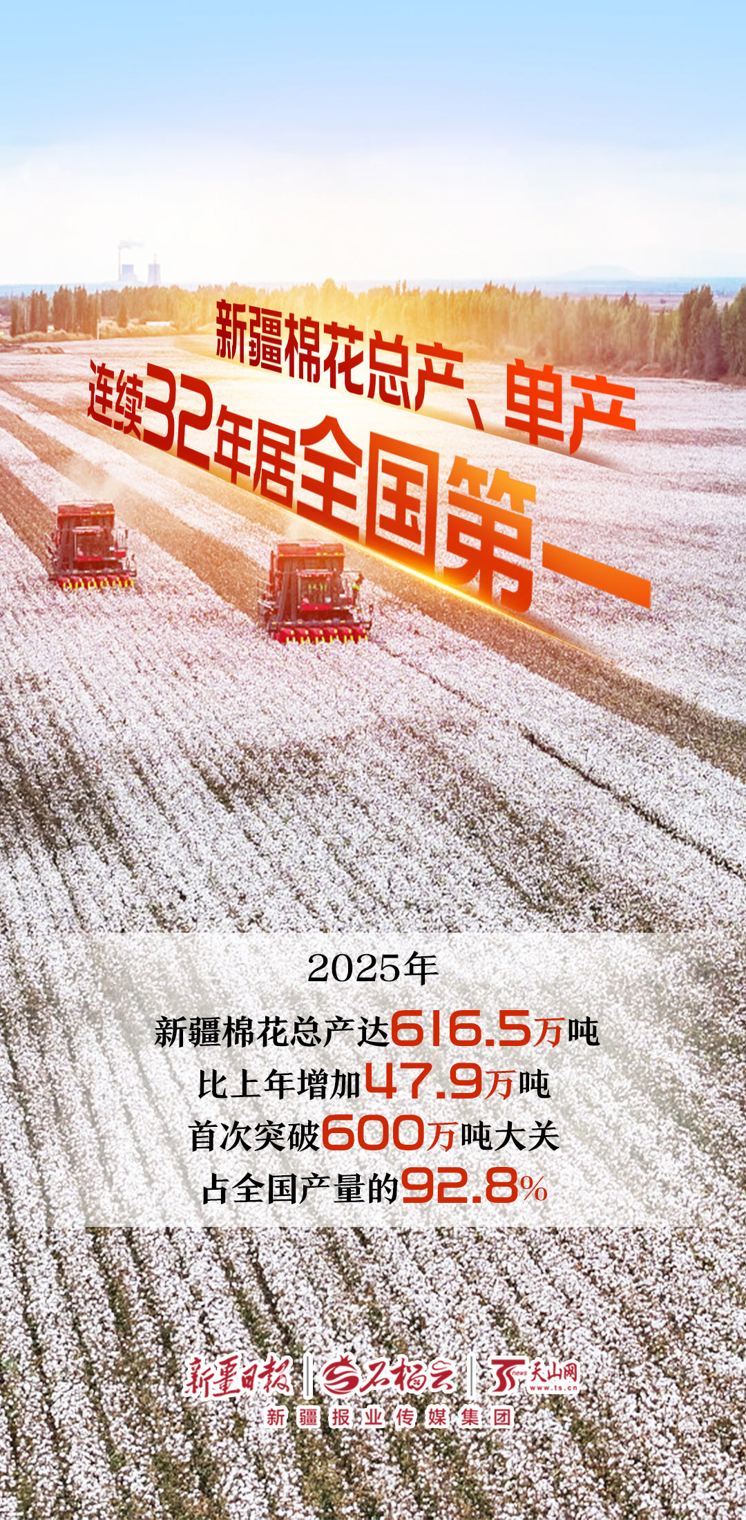 石榴云/新疆日报讯(记者 刘毅报道)12月30日,记者从自治区农业农村厅获悉:2025年,新疆棉花总产达616.5万吨,比上年增加47.9万吨,首次突破600万吨大关,占全国产量的92.8%,总产、单产连续32年居全国第一。