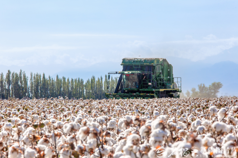 9月17日,一辆采棉机在精河县大河沿子镇呼和哈夏南村棉田采收棉花。图/博尔塔拉融媒体中心提供