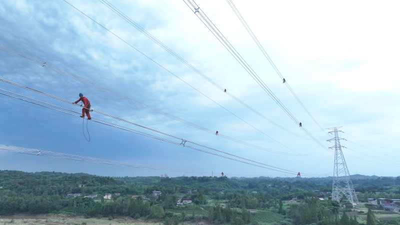 重庆送变电公司员工在“疆电入渝”配套工程500千伏渝岳线跨嘉陵江安装间隔棒。周亚摄