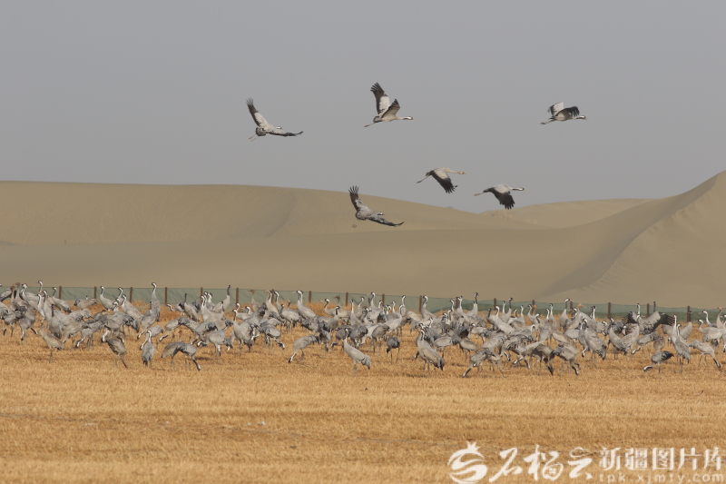 11月1日,在和田市吉亚乡团结新村附近,成群的灰鹤在悠然觅食。陈文杰摄