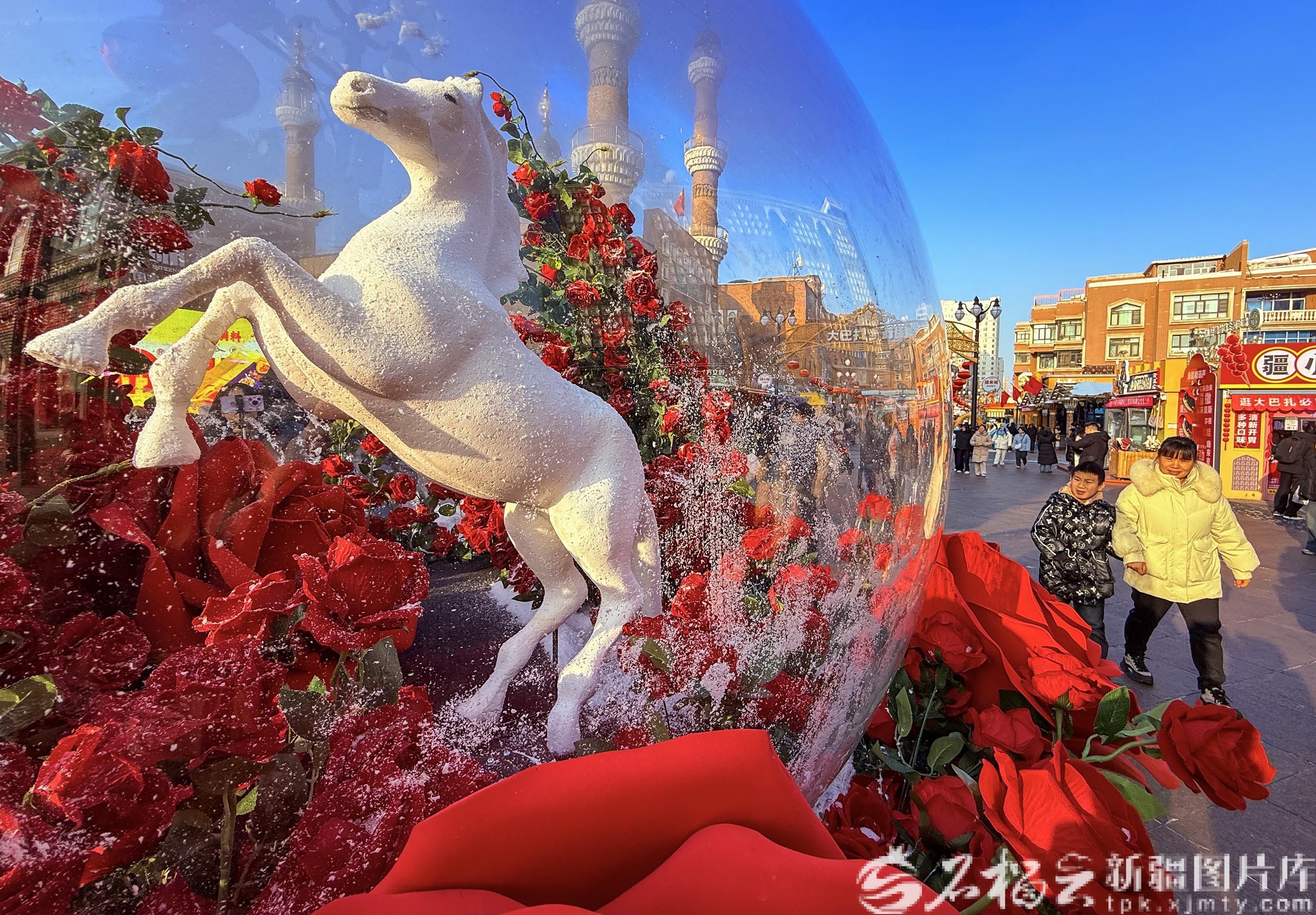 1月1日,新疆国际大巴扎,白色骏马玻璃球造型景观吸引游客观赏。