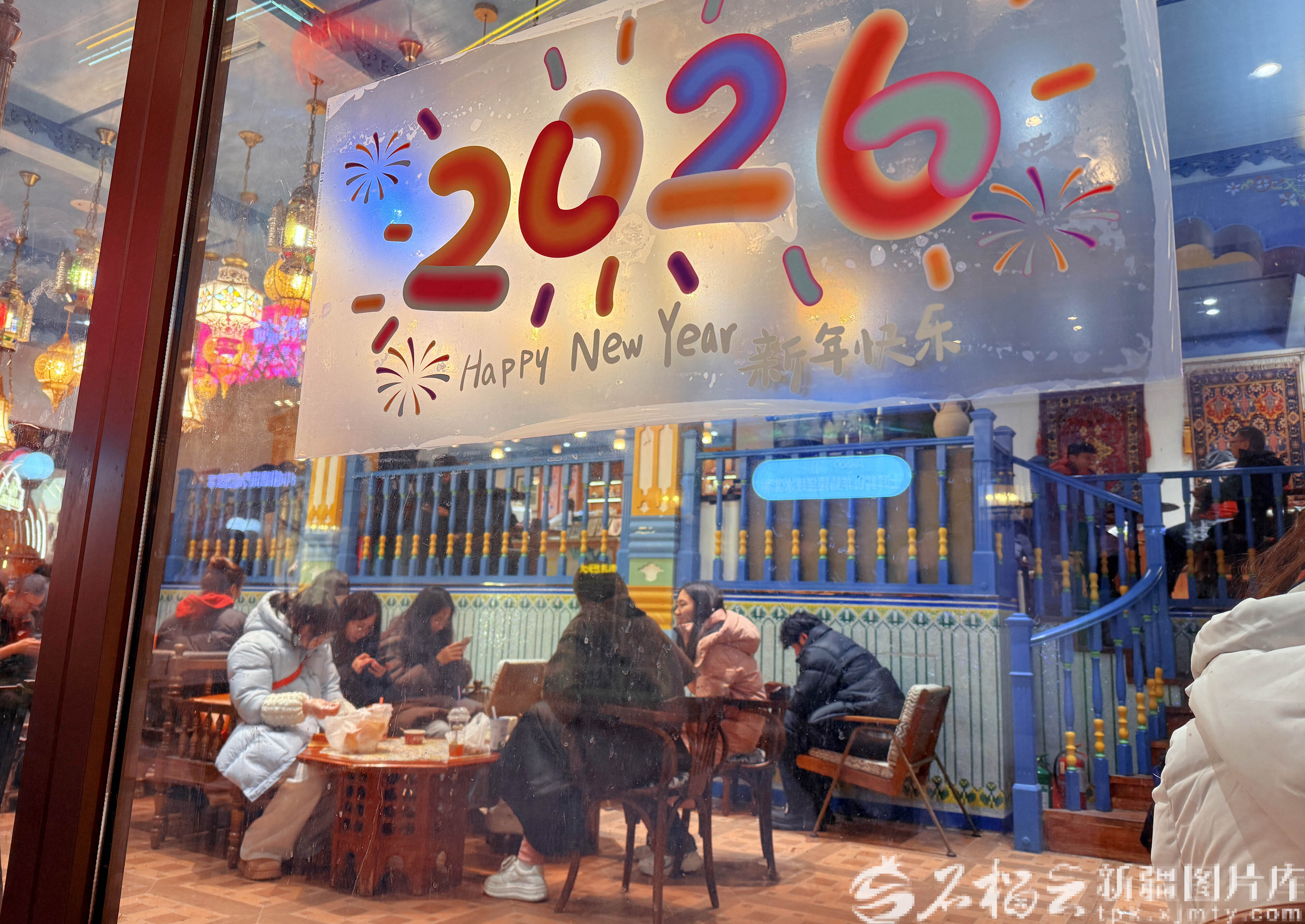1月1日,游客在乌鲁木齐大巴扎步行街二期疆来城石榴花巷的一家餐饮店品尝美食,乐享元旦假期美好时光。