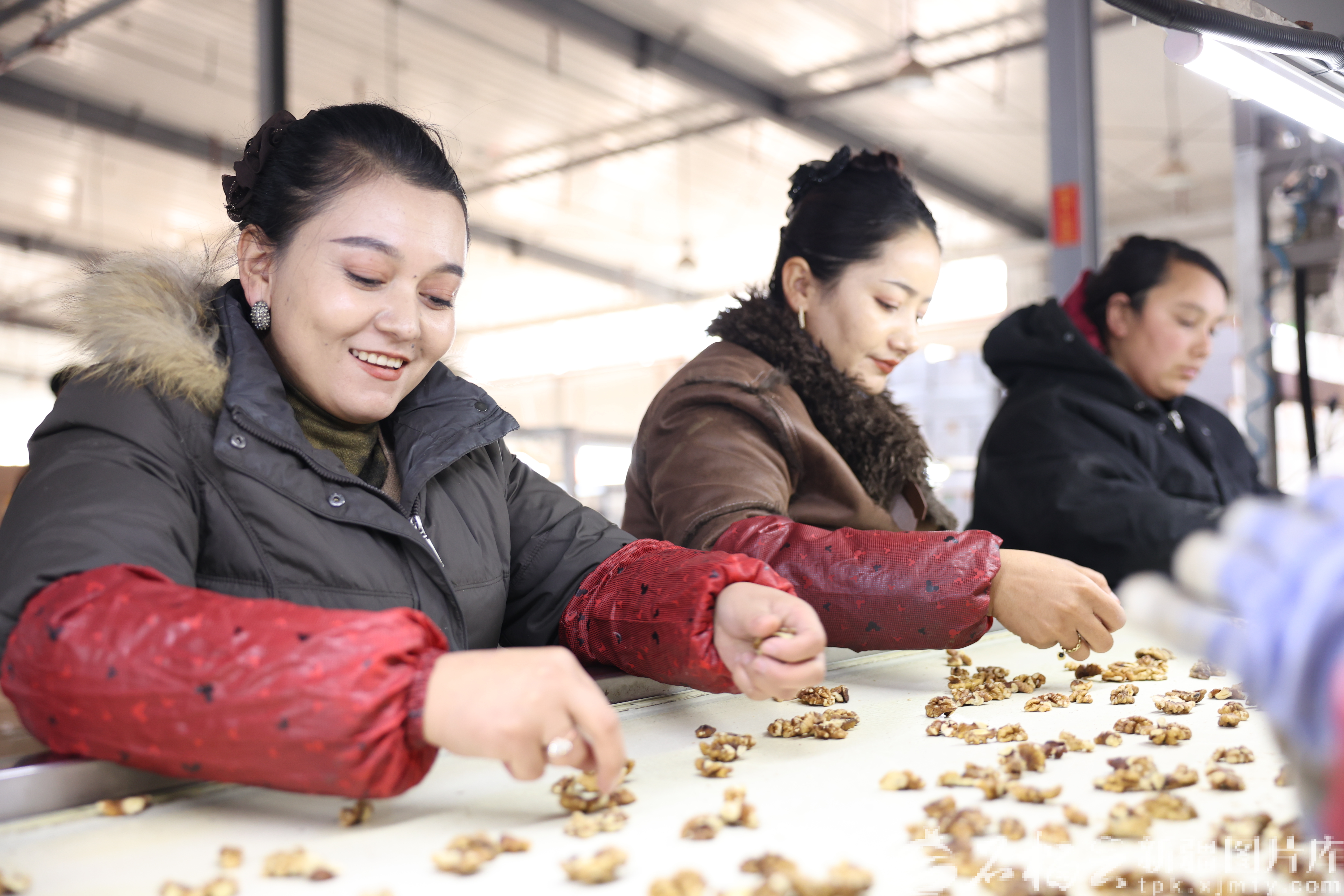 2025年12月9日,阿克塔什镇就业产业园员工古再丽努尔·阿不都克热木(左一)在分拣核桃仁。苏比怒尔·吐鲁洪 摄