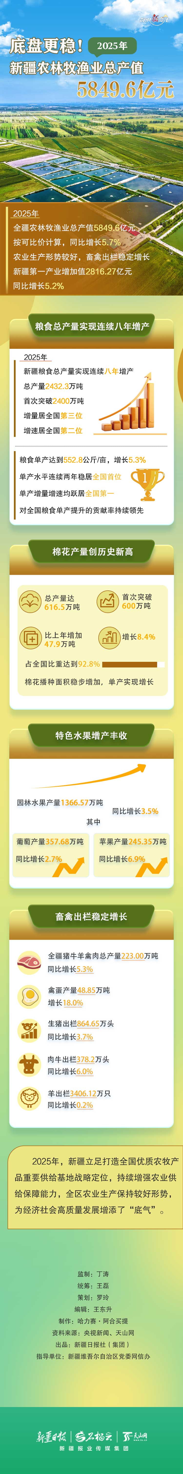 2025年,新疆农林牧渔业总产值5849.6亿元,按可比价计算,同比增长5.7%。农业生产交出了怎样的成绩单?“大果篮”丰盈度如何?畜禽出栏情况又怎样?本期《数说“新”变化》一起来看看。