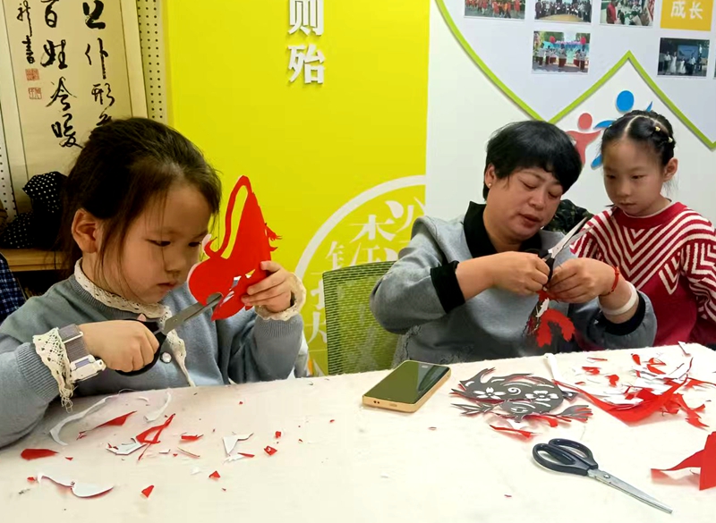 在孩子们动手创作的过程中,王文忠还教大家如何剪出带有吉祥寓意的纹样。张文莉耐心指导孩子们动手创作,随着纸屑纷纷落下,一张张红纸变成了活灵活现的剪纸作品,也成了连接老少两代人的文化纽带。