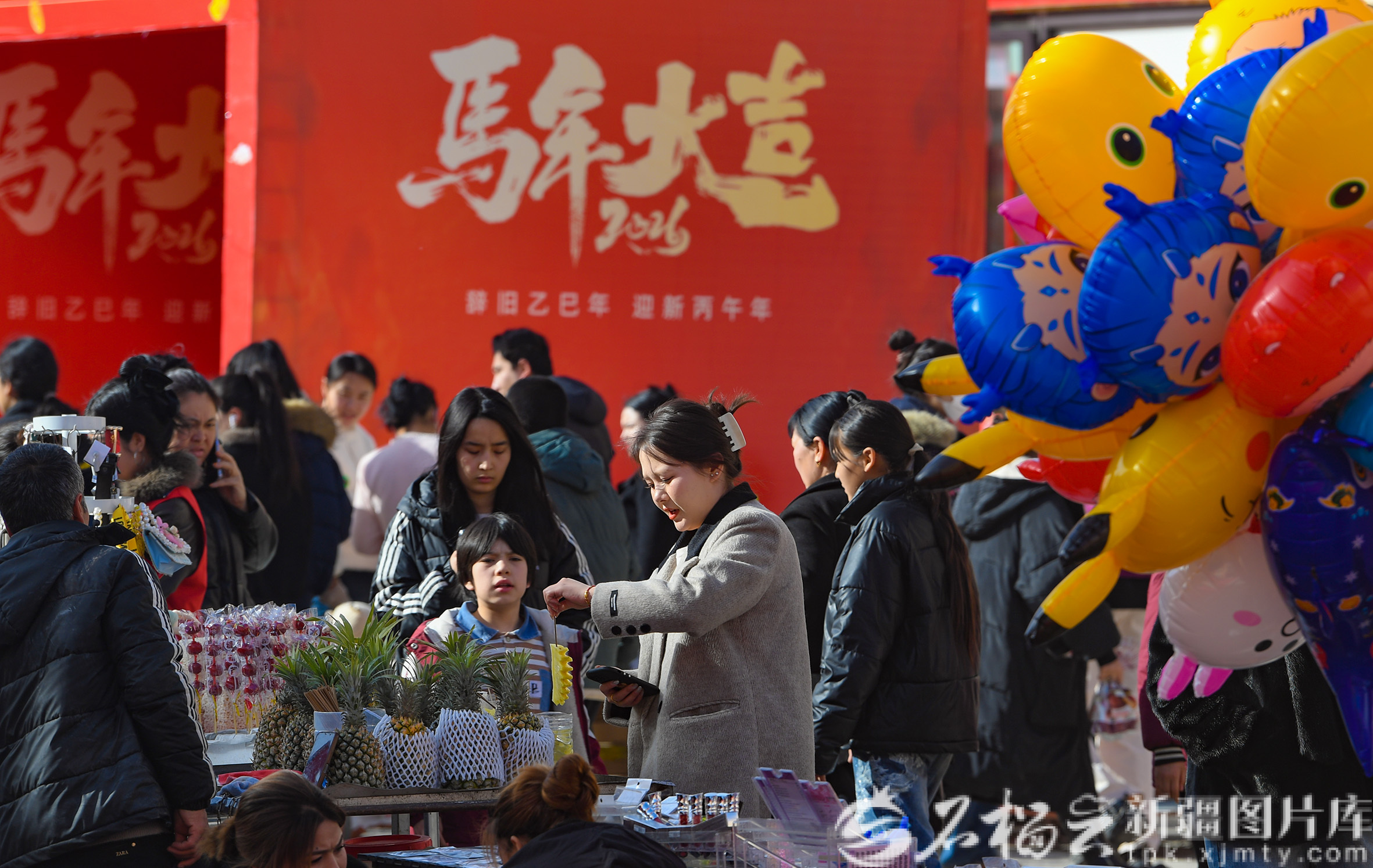 12月12日,在洛浦玉街年货大集一位母亲为孩子选购气球。