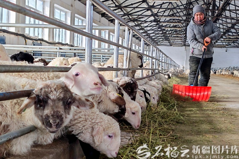 2月11日,工人在巴里坤农牧业投资集团有限公司养殖基地喂羊。