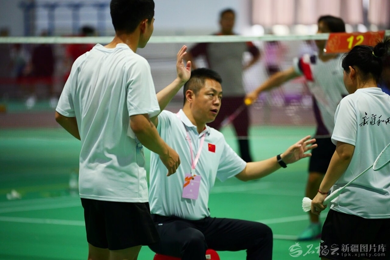 在自治区第二届大学生校园羽毛球联赛中,天津援疆教师宋会涛(左二)指导新疆和田学院混双队伍比赛(2025年6月7日摄)。卢瑛摄