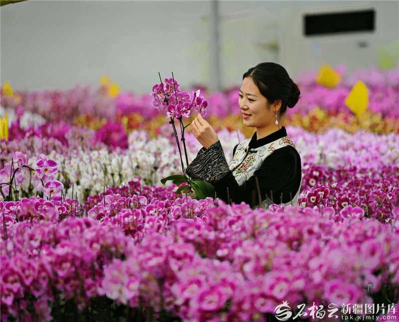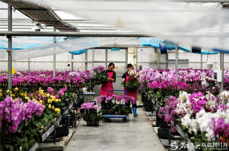 2月25日,员工在新疆万润丰花卉基地智能温室内搬运蝴蝶兰。天山网-新疆日报记者王立华摄