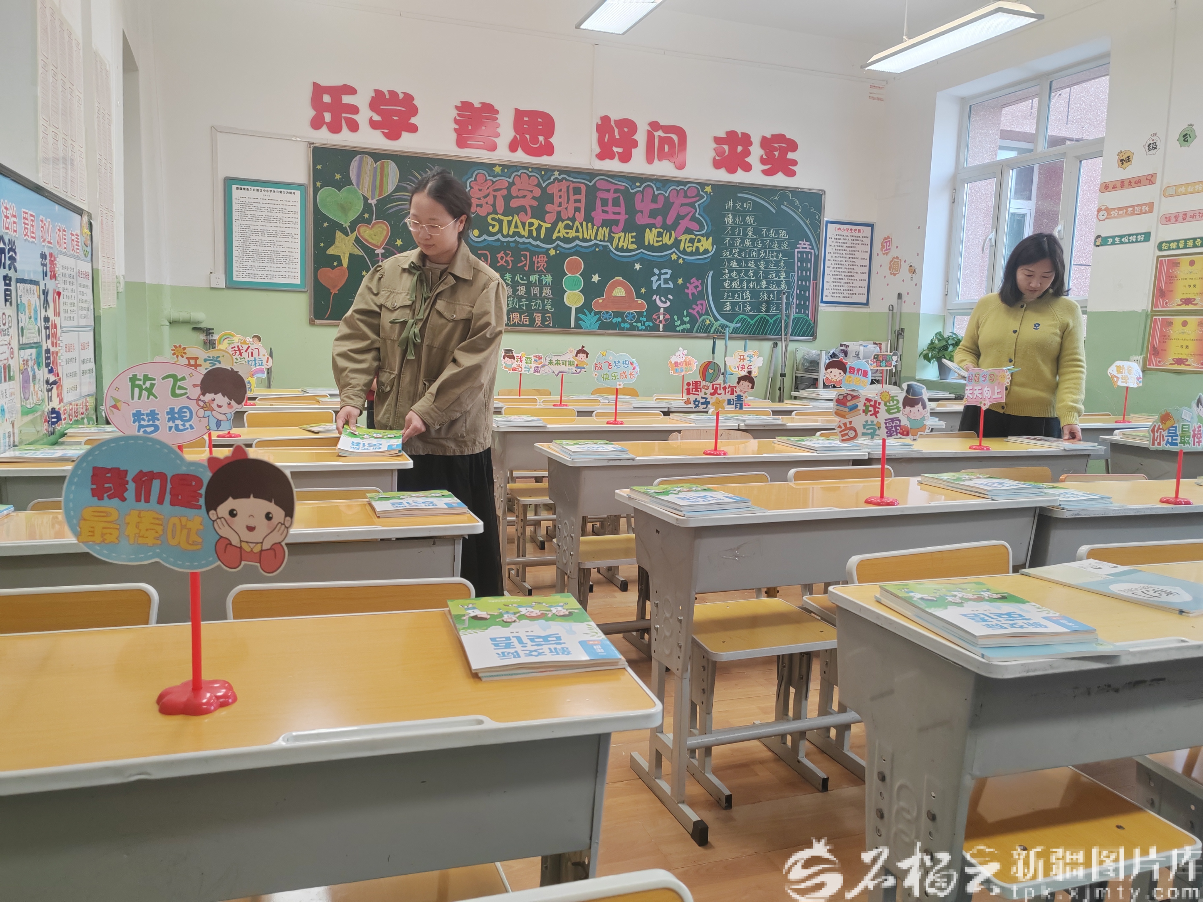 精心设计的新学期开学板报,课桌上摆放着崭新的课本。2月27日,提前到岗的乌鲁木齐市第35小学教师们将教室装扮一新,校园里洋溢着迎接新学期的开学氛围。