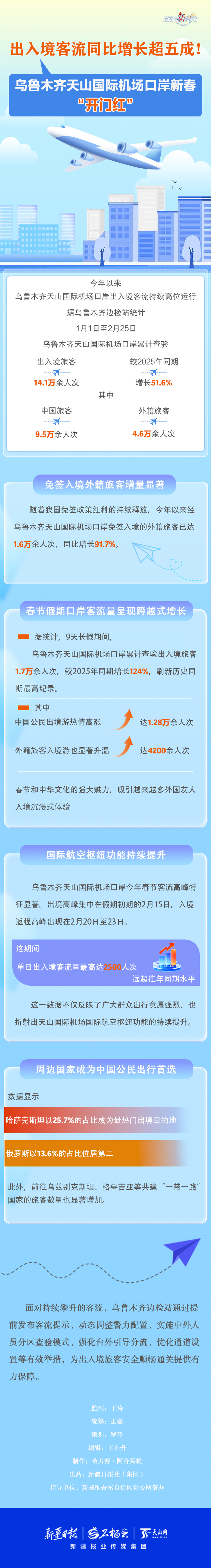 据乌鲁木齐边检站统计,1月1日至2月25日,乌鲁木齐天山国际机场口岸累计查验出入境旅客14.1万余人次,较2025年同期增长51.6%。这一显著增长背后,得益于哪些有利因素?口岸客流量攀升的原因是什么?本期《数说“新”变化》为您解析。