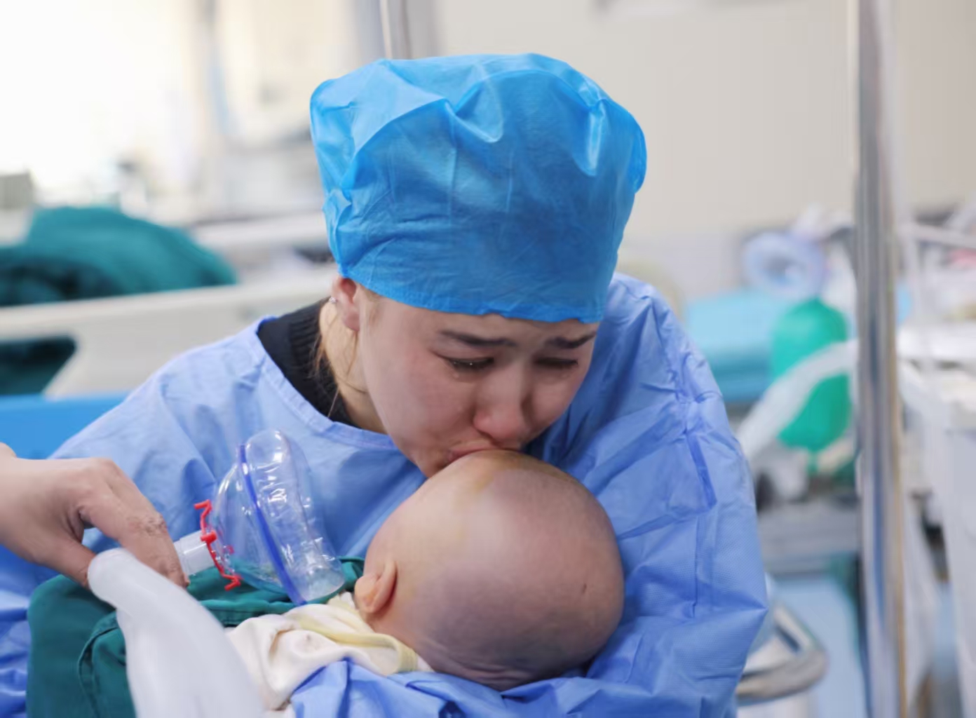 3月7日,唇腭裂患儿顺利完成手术,患儿母亲喜极而泣。喀什地区第二人民医院供图
