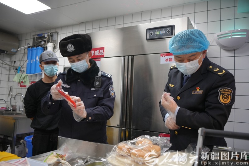 3月13日,布尔津县公安局环食药侦大队民警与市监局工作人员检查餐饮服务行业。 邢荣摄