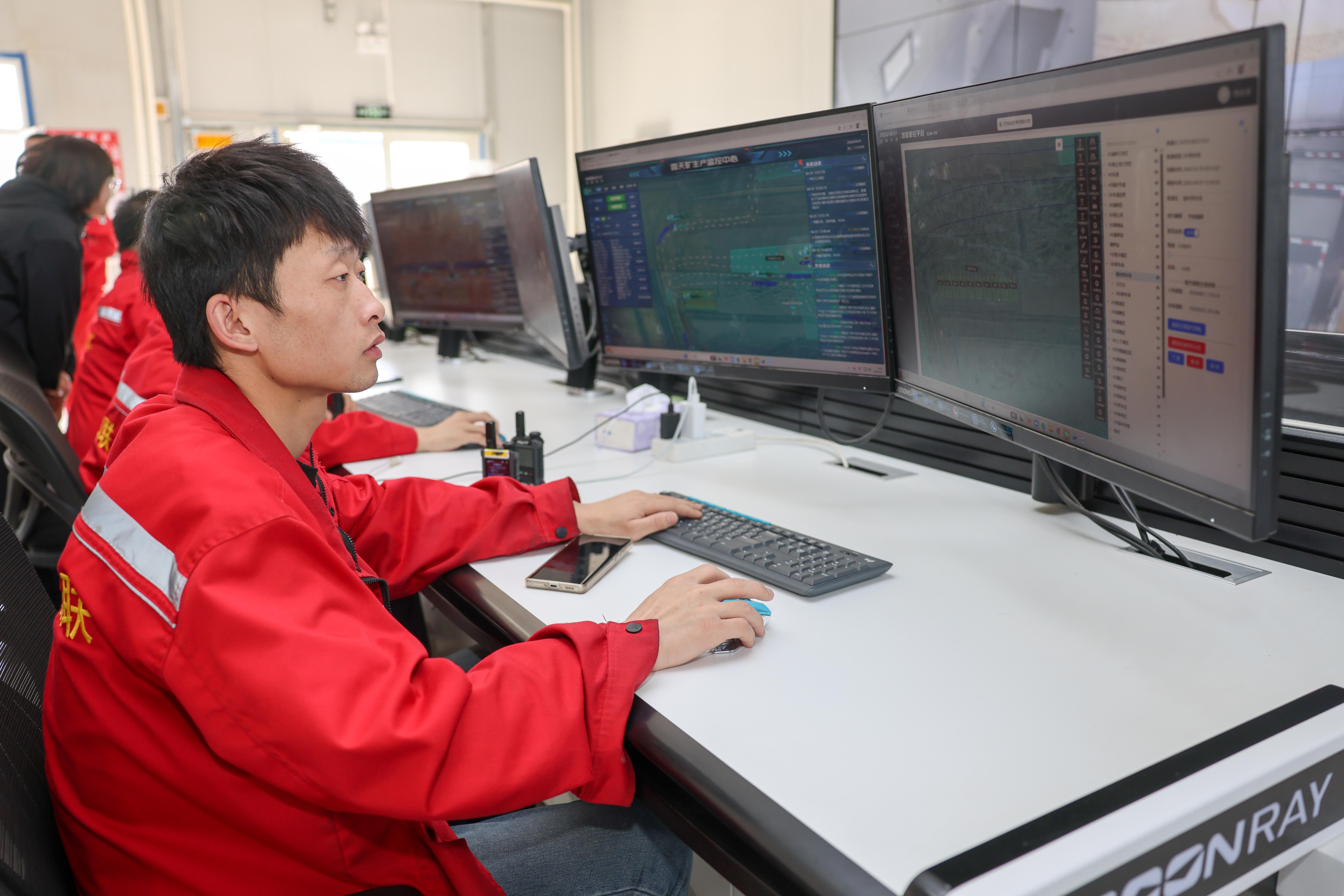 从矿坑观景台来到调度应急指挥中心,这座智慧矿山的“大脑中枢”正有条不紊地运转。巨大的监控屏上,矿区采剥、运输、装卸全流程的作业数据实时跳动,每一台无人矿卡的作业任务、运行轨迹、电量消耗都清晰可查。