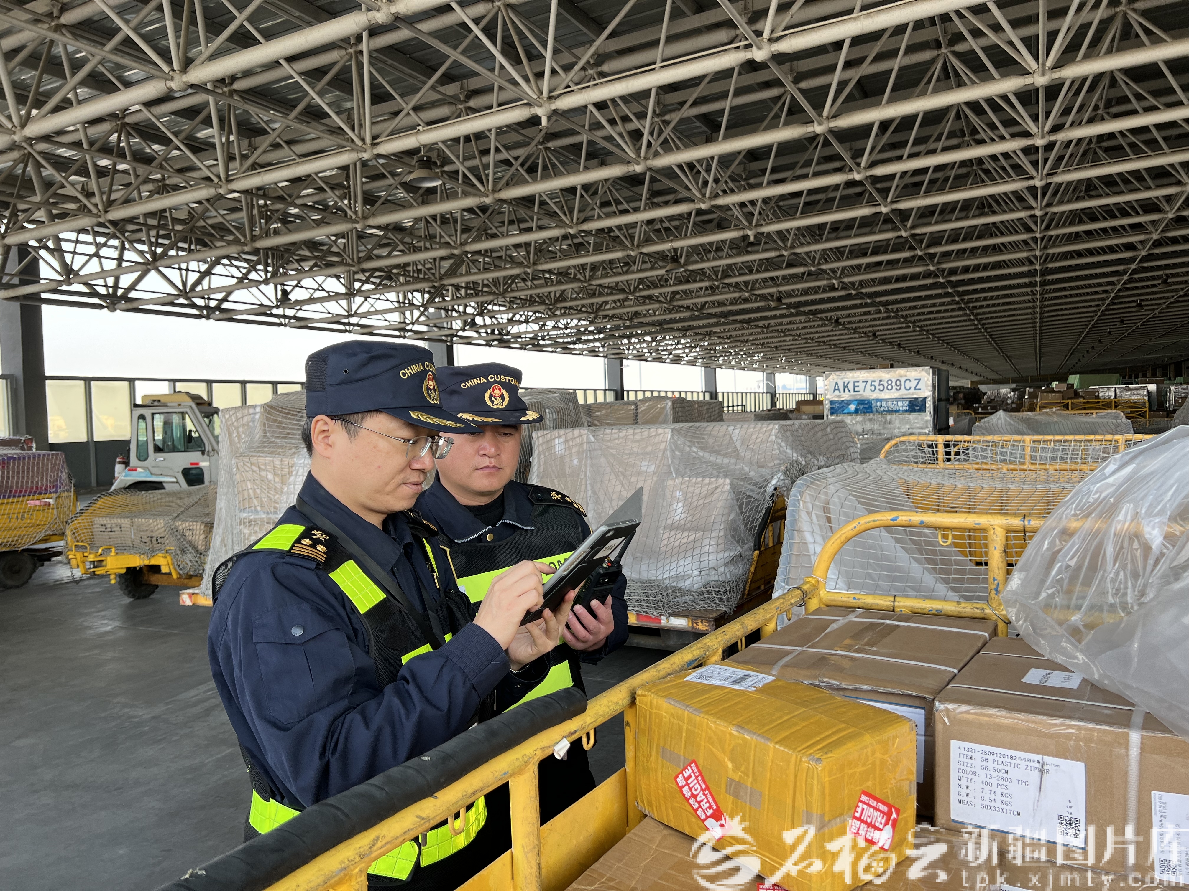 4月14日,乌鲁木齐天山机场海关货运监管科现场关员正在对一票即将出境的跨境电商货物进行查验。刘飞虎摄