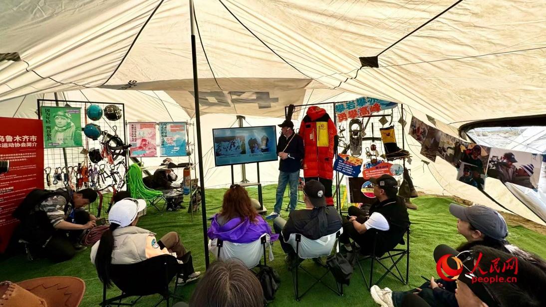 游客在世界魔鬼城帐篷营地聆听户外攀登知识讲解。人民网 李龙摄