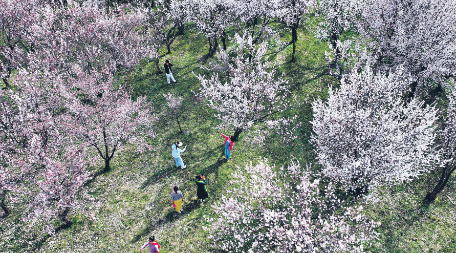 4月20日,昌吉市硫磺沟镇楼庄子村的杏园里,连片杏花竞相绽放,吸引游客赏花打卡。昌吉市融媒体中心供图