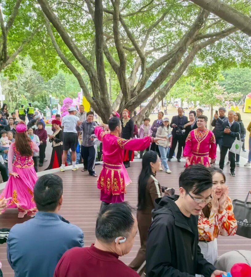 来自黑龙江的游客张卓举着手机全程录制,激动地说:“本来是冲深圳簕杜鹃来的,没想到被阿克苏文旅狠狠圈粉。舞者的热情、音乐的独特魅力,让我对那片土地充满好奇,回家就做攻略,一定要去阿克苏旅游。”