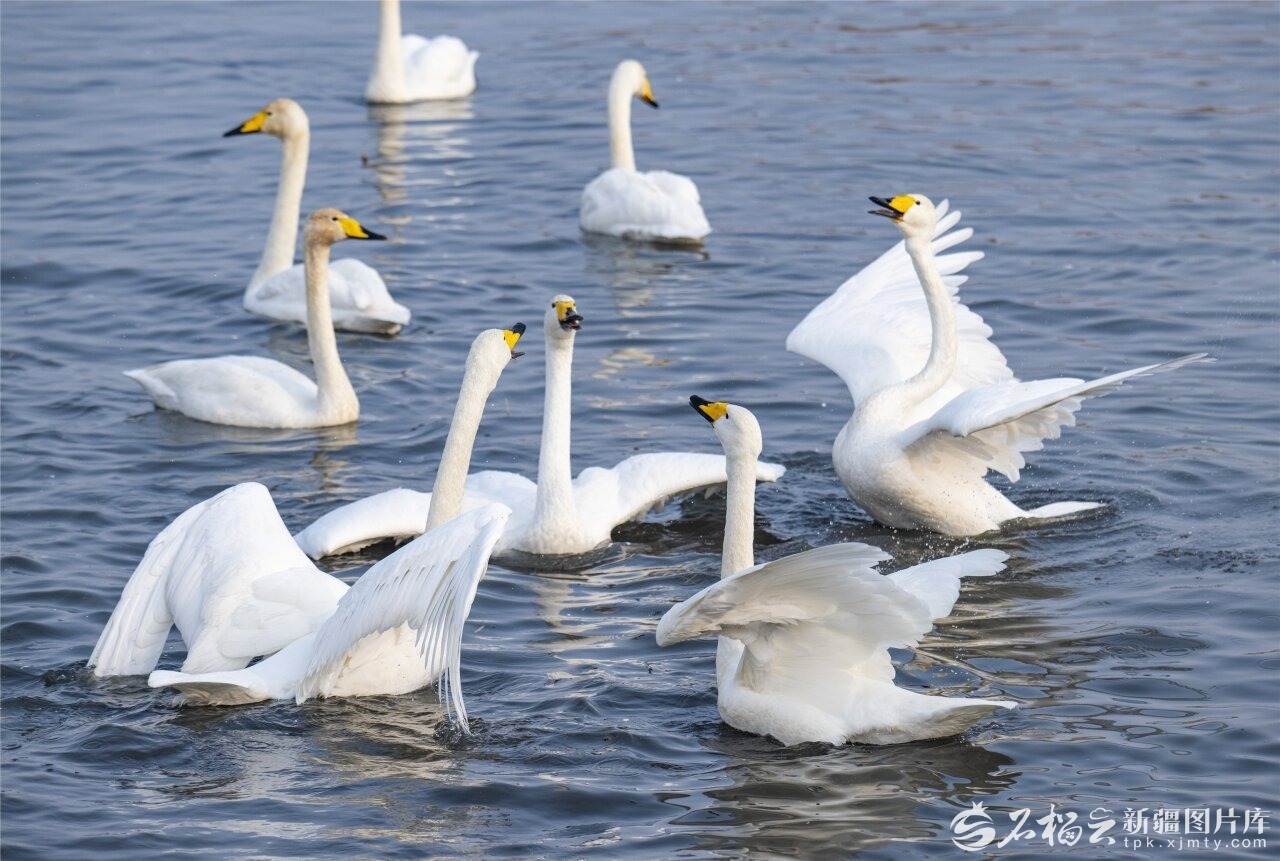 12月8日,昌吉回族自治州玛纳斯国家湿地公园,大天鹅在湖面嬉闹。何龙摄