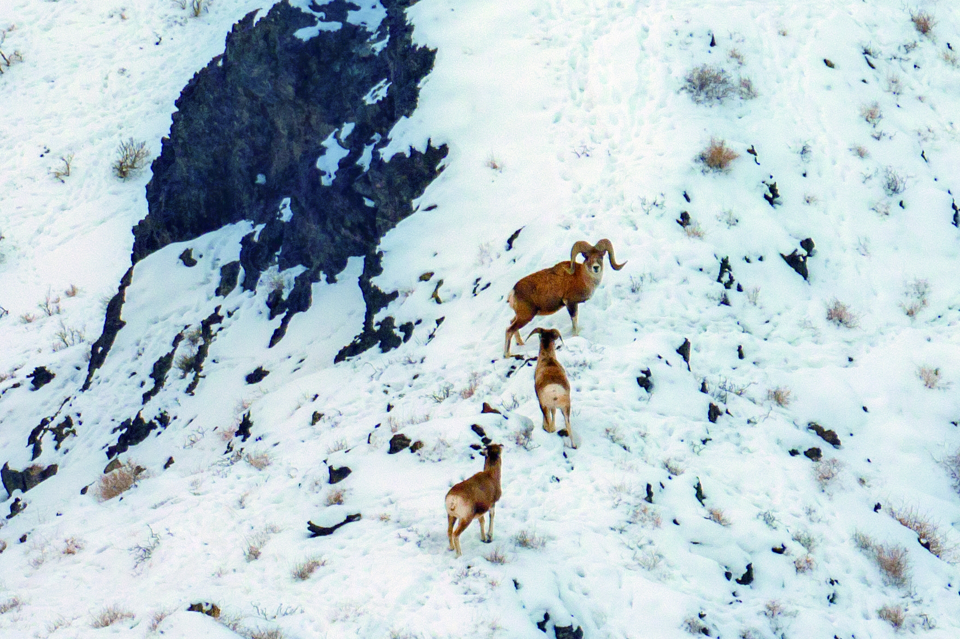 克拉玛依市区北部的山丘荒漠区,盘羊在雪中觅食。闵勇/摄