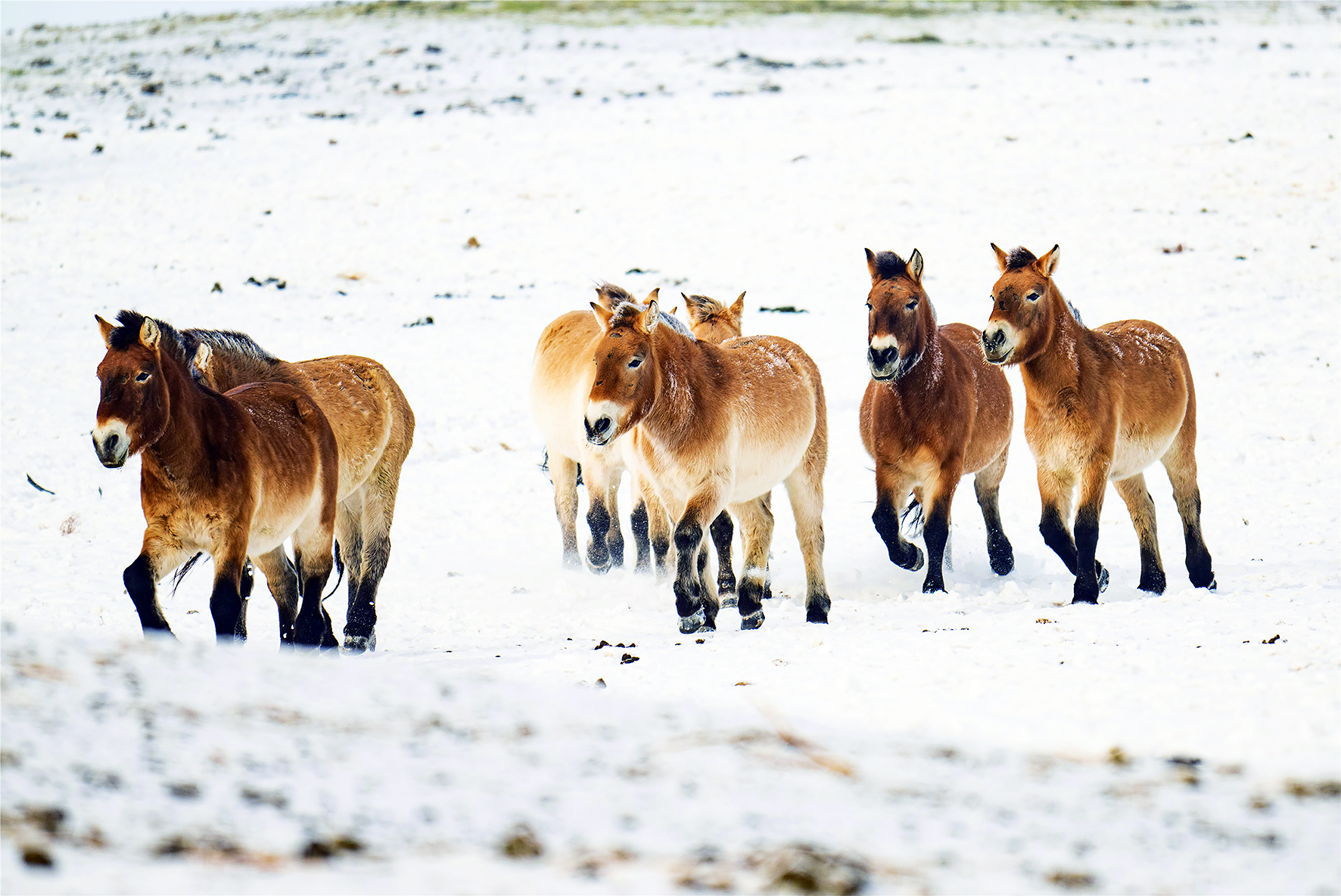 新疆卡拉麦里山有蹄类野生动物自然保护区乔木西拜普氏野马监测站,普氏野马在雪地里奔跑。何龙/摄