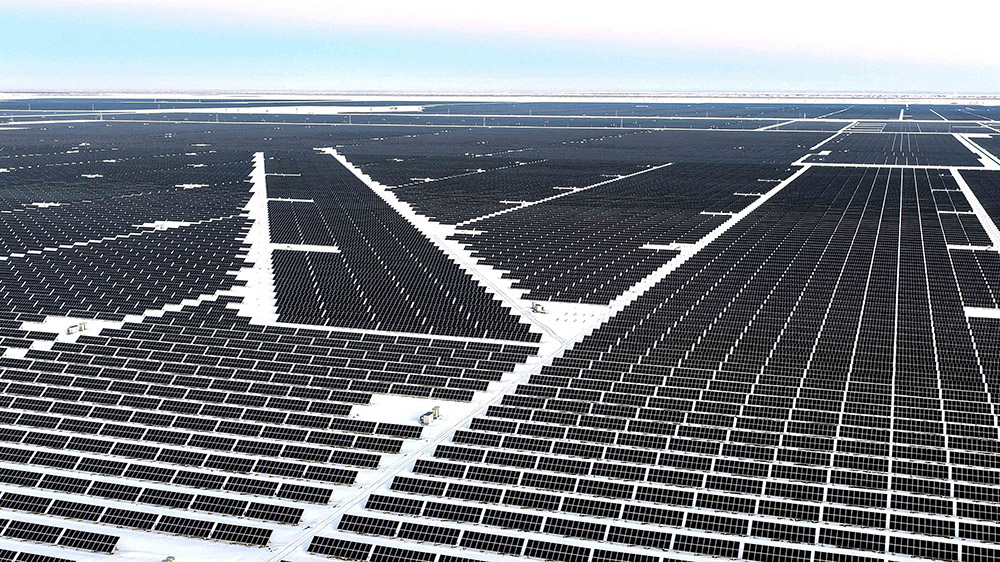 1月24日,新疆昌吉回族自治州木垒哈萨克自治县,光伏产业园犹如茫茫雪原上的蔚蓝大海,冰雪铺展如素笺、光伏板列阵似铠甲,阳光倾洒,板面熠熠生辉。光电在无声中转换,电流在寂静中奔涌,为这片荒原注入无限生机。