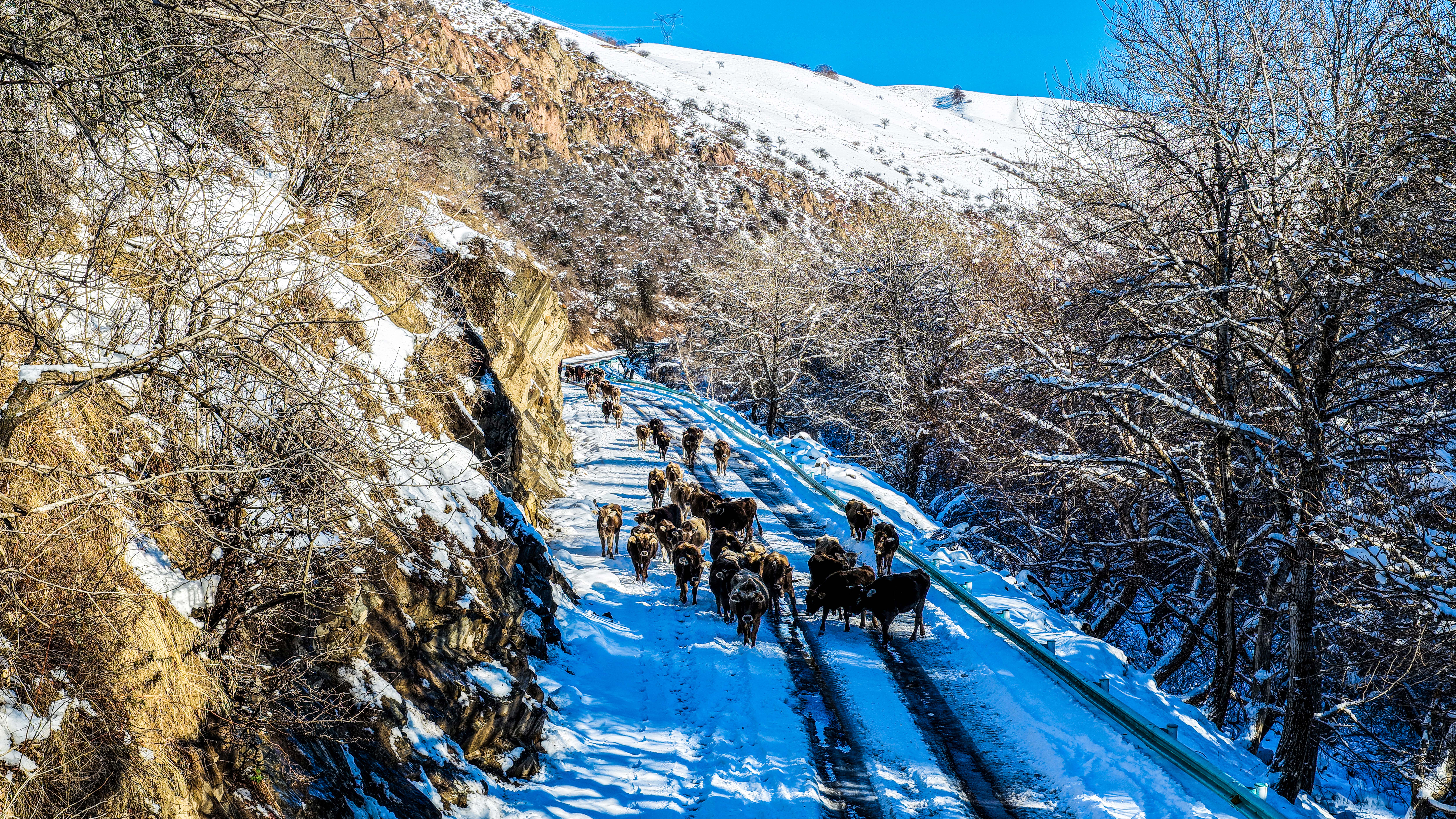 放牧的牛在山路上漫步,画面宁静而悠远。