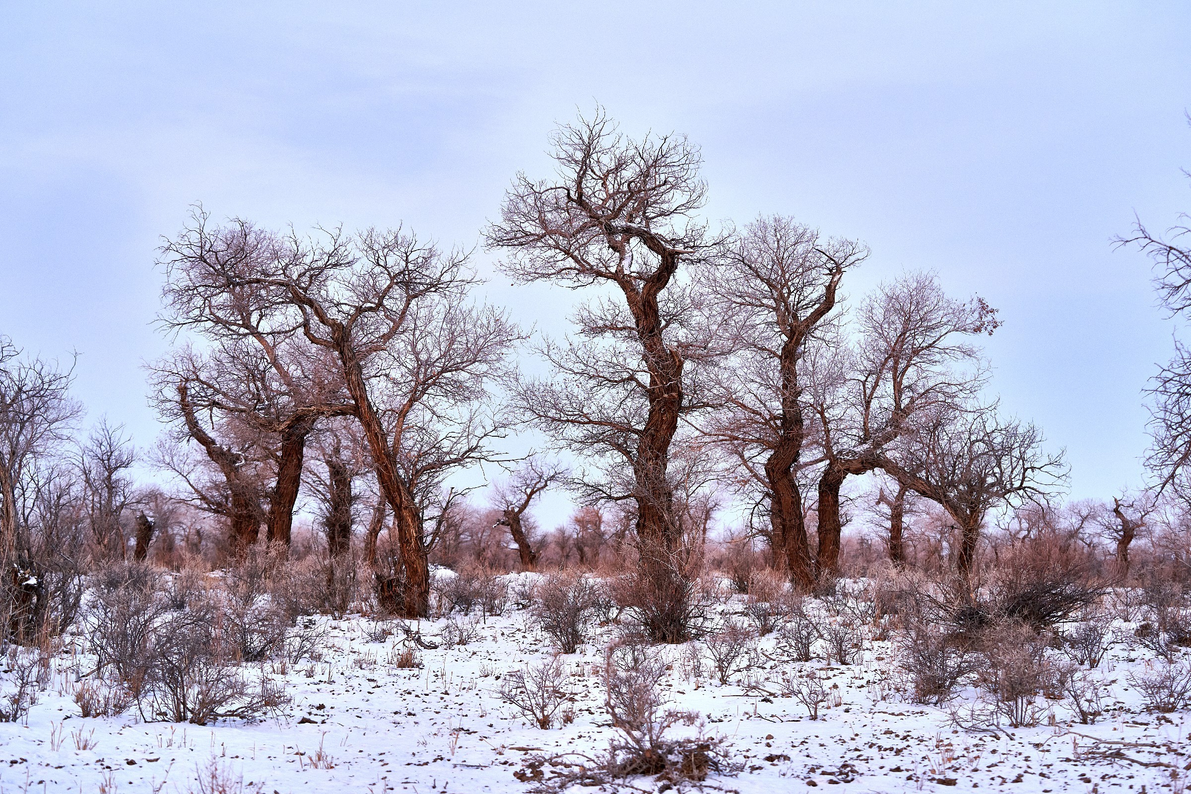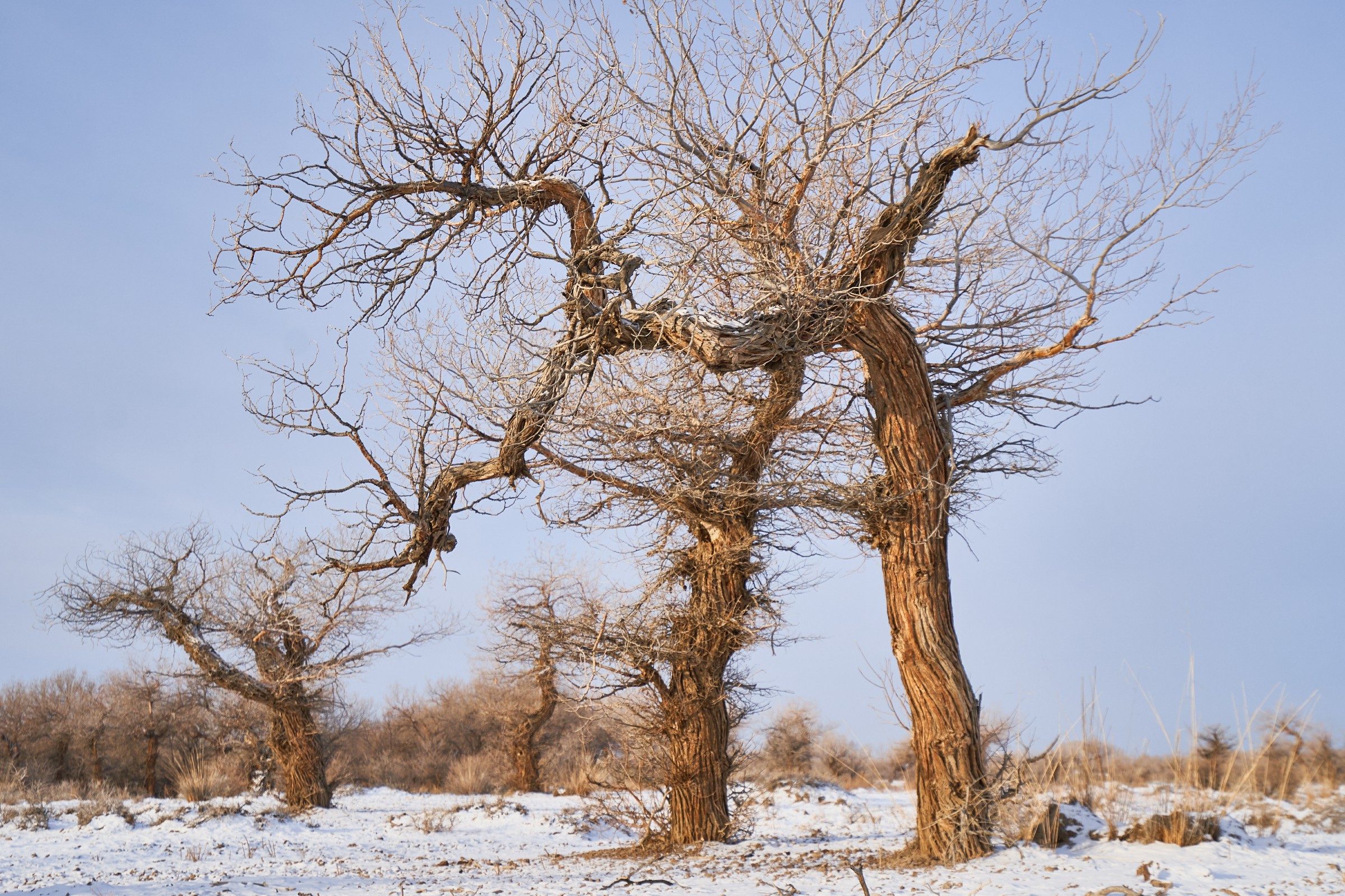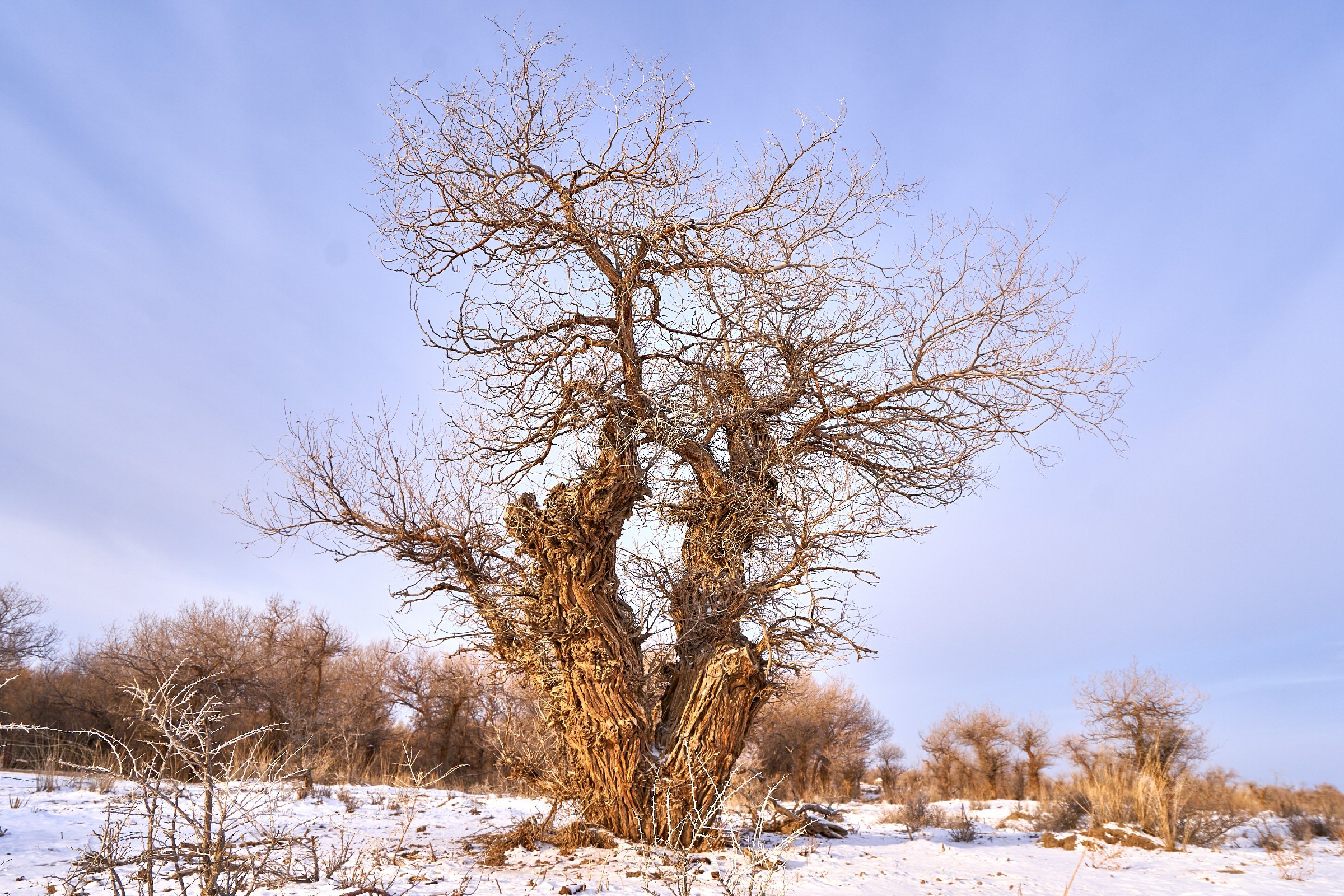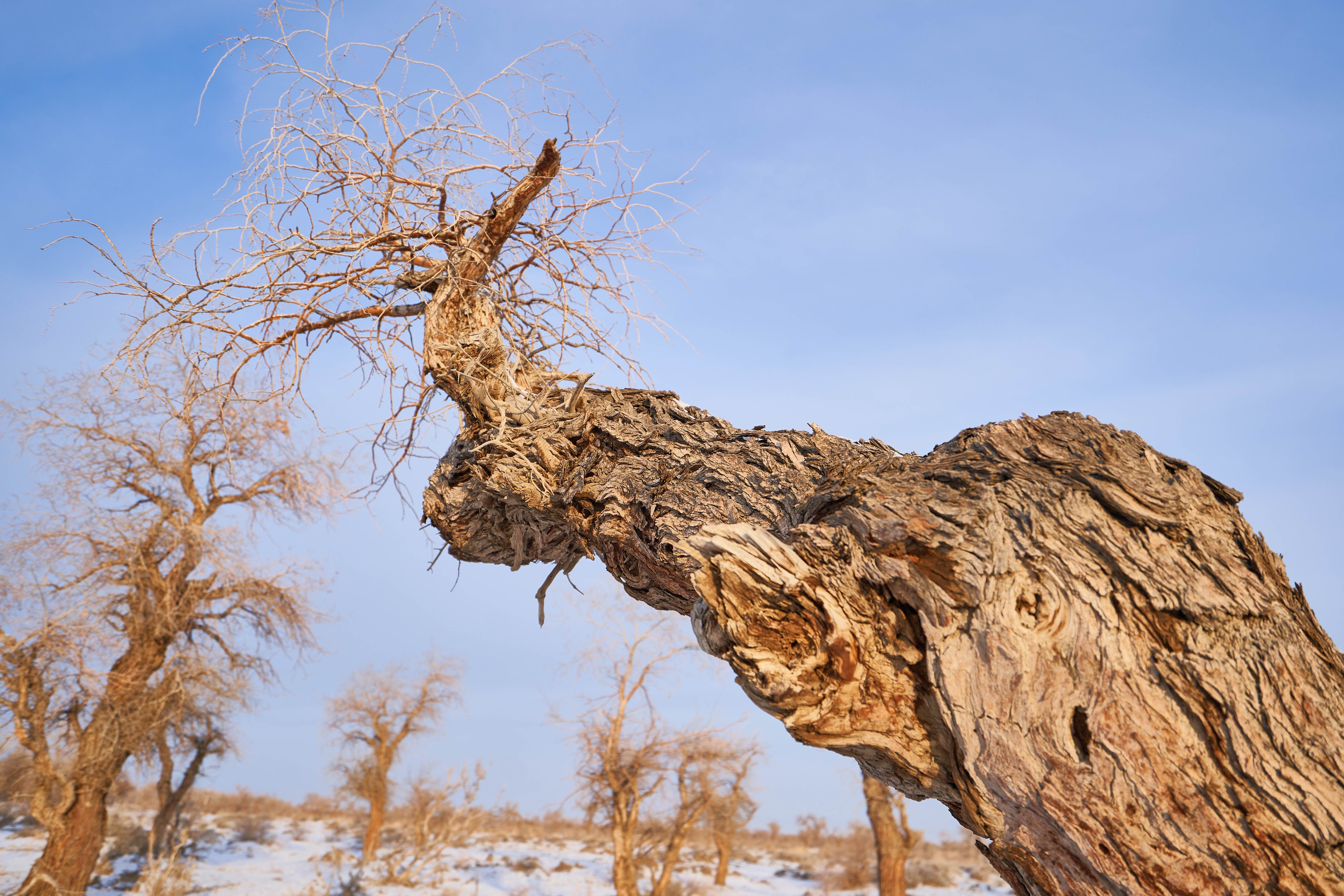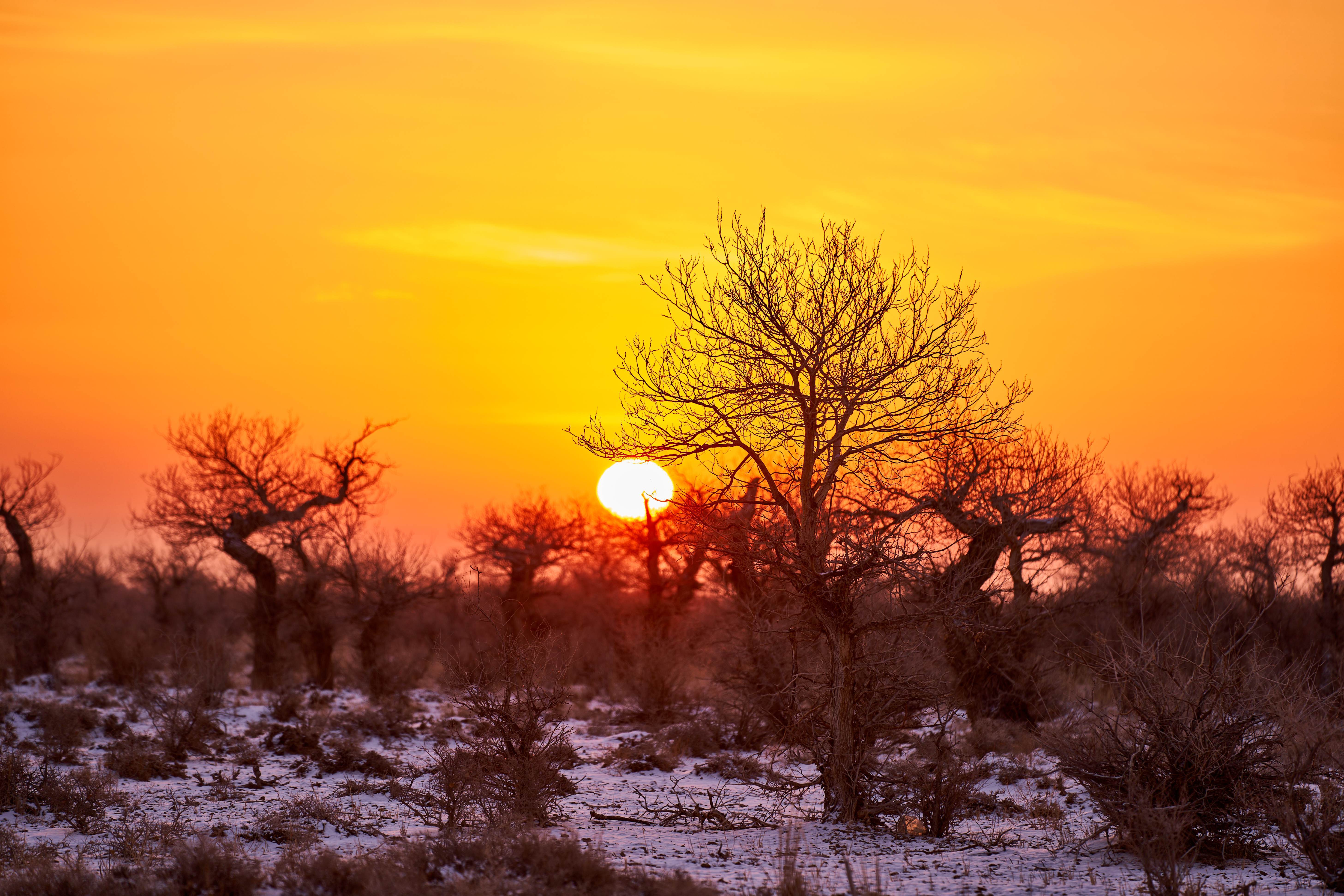 2月12日,在新疆塔城地区托里县白杨河林场,沐浴在晨光中的胡杨林美不胜收。天边一抹绯红朝霞,朝阳顺着天际缓缓升起,穿透苍劲虬枝,为远处的胡杨镀上一层温柔的金边。胡杨的枝干或遒劲挺拔,或蜿蜒如弓,皲裂的树皮镌刻着岁月的痕迹,光秃的枝丫在澄澈的天空下肆意舒展,仿佛在与晨光对话。