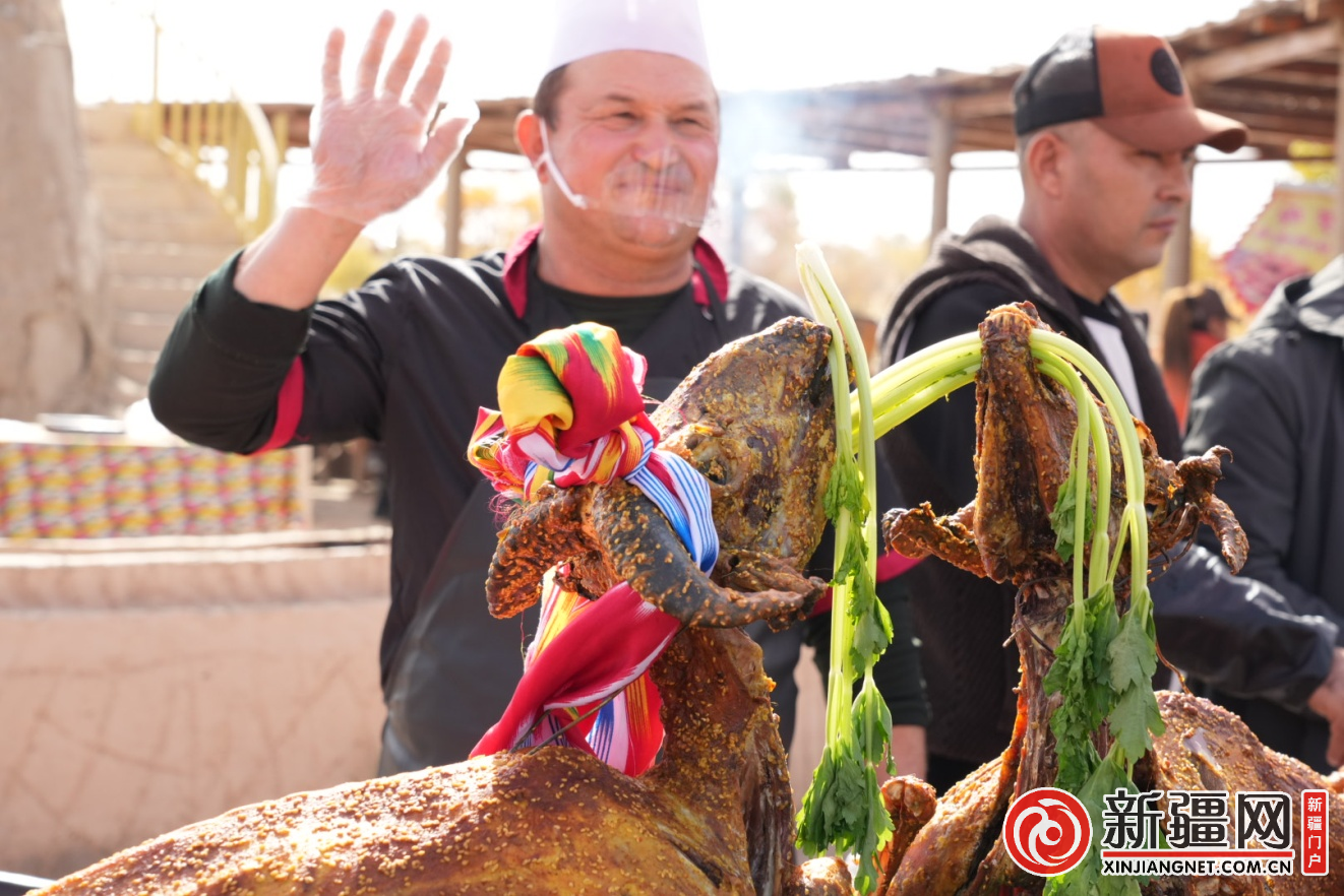 罗布人村寨景区的特色美食沙漠烤鱼(上图)、烤全羊(下图)等都吸引了大量游客前往品尝。(利雨霖摄)