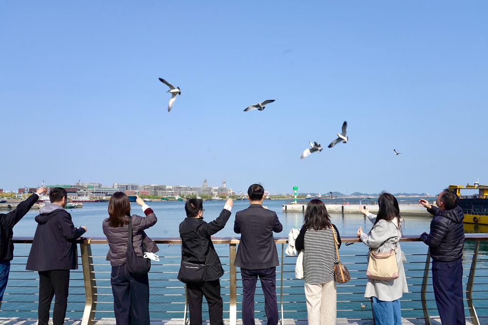 胶东在线10月29日讯(记者 邬勇 刘菲 摄影 金鑫)10月29日,阳光明媚,天蓝海碧。芝罘湾广场上,但见海鸥翔集,时而翩跹舞动海浪,时而与岸边的市民、游客以及来自国家级、省级媒体,全国城市网媒的总编、记者们“深情对话”,瞬间治愈人间烦忧。这是第二十一届(2025)中国城市新闻网媒联盟联席会暨百城百名网媒总编辑看烟台活动的“浪漫时刻”。