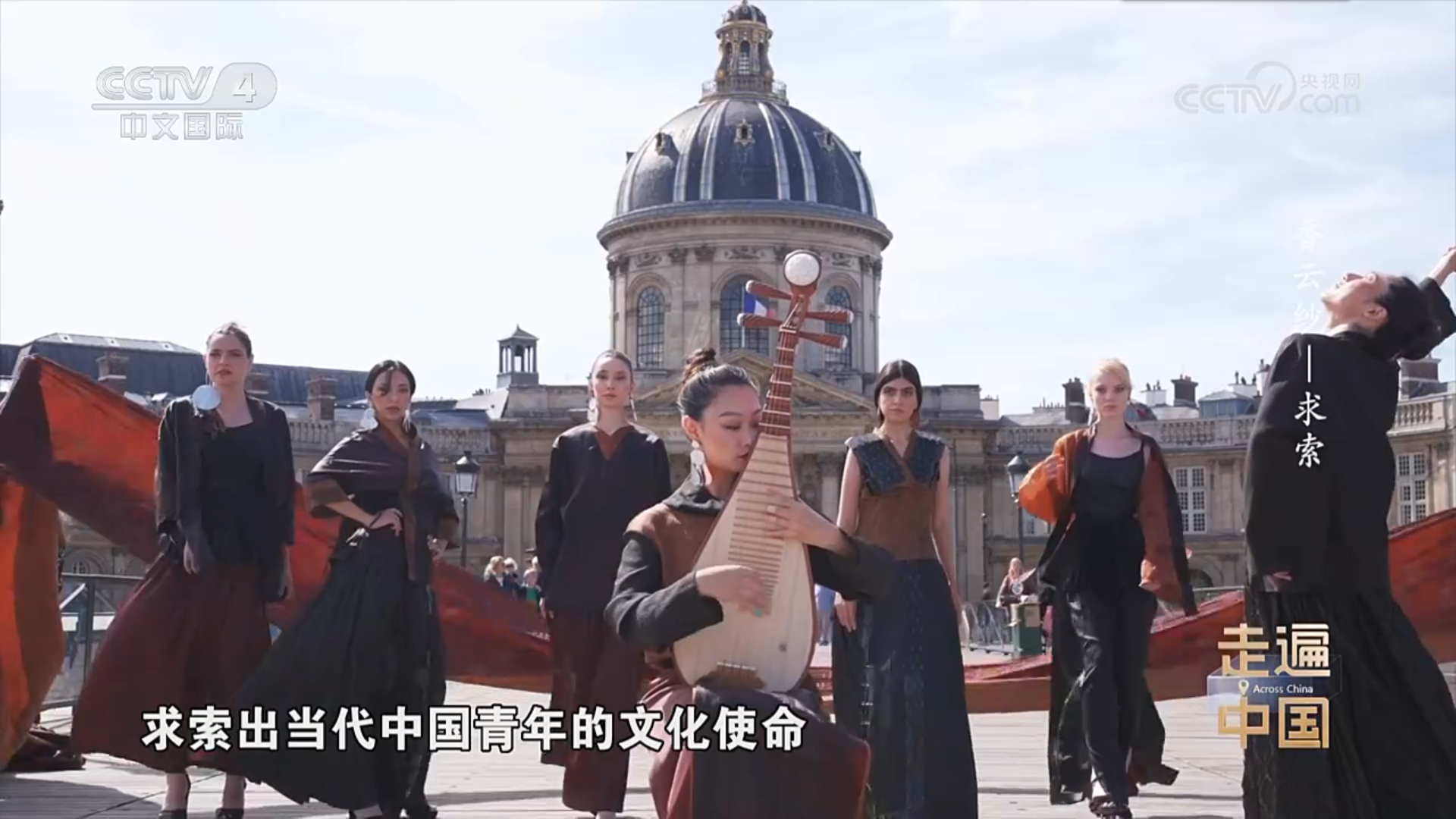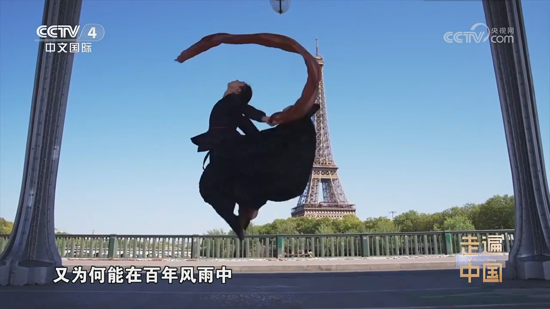 舞者身穿香云纱在法国巴黎街头翩翩起舞。