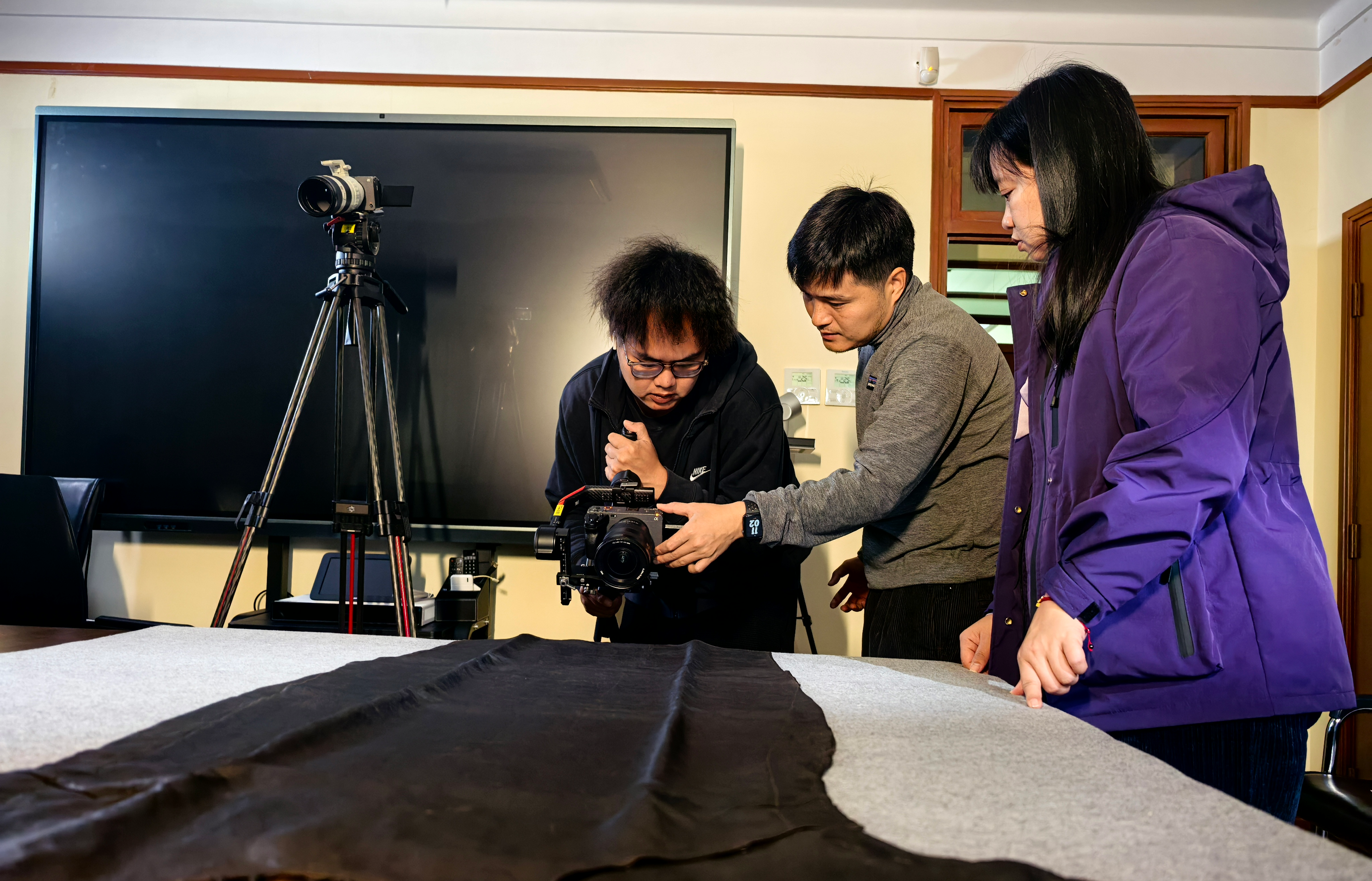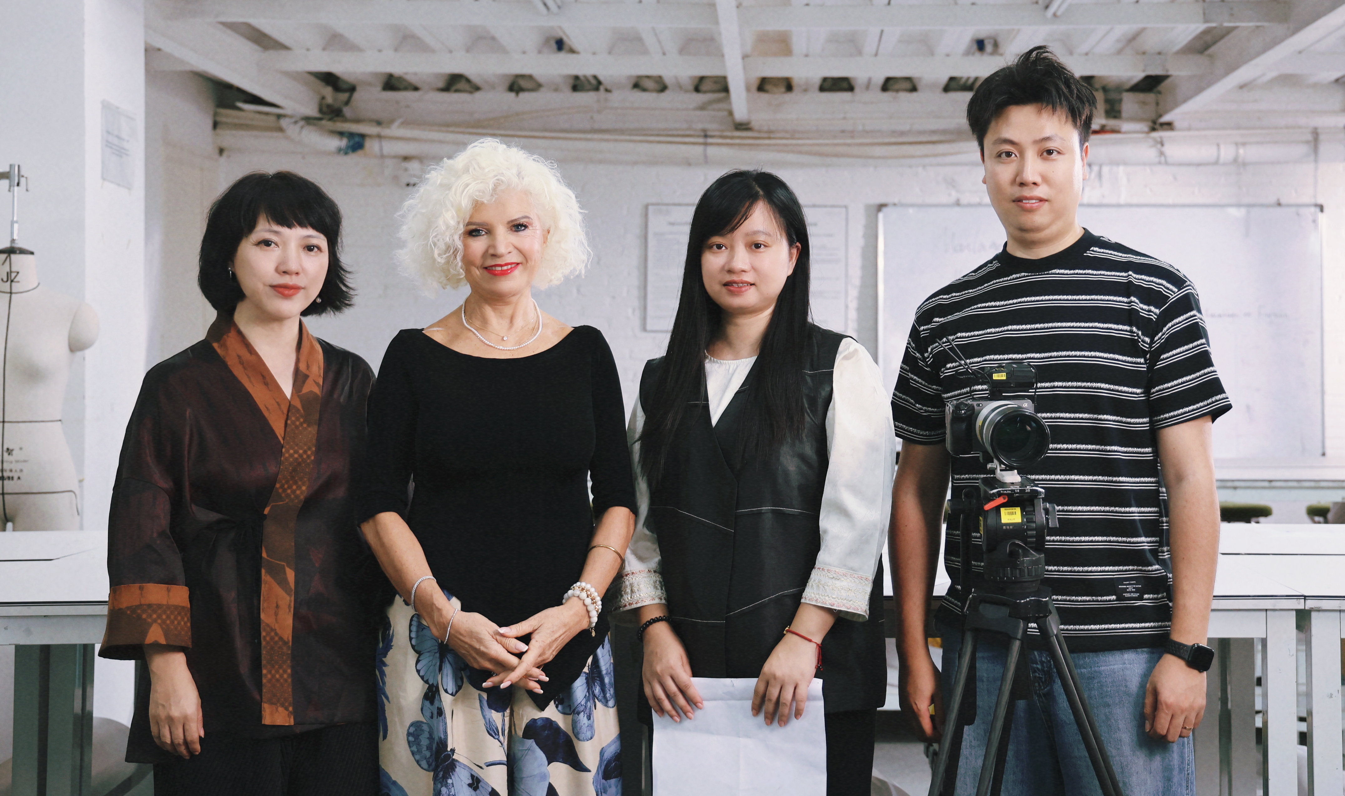 佛山香云纱设计师陈巍回到母校法国巴黎高等时装学院与老师们分享原创女书香云纱面料。